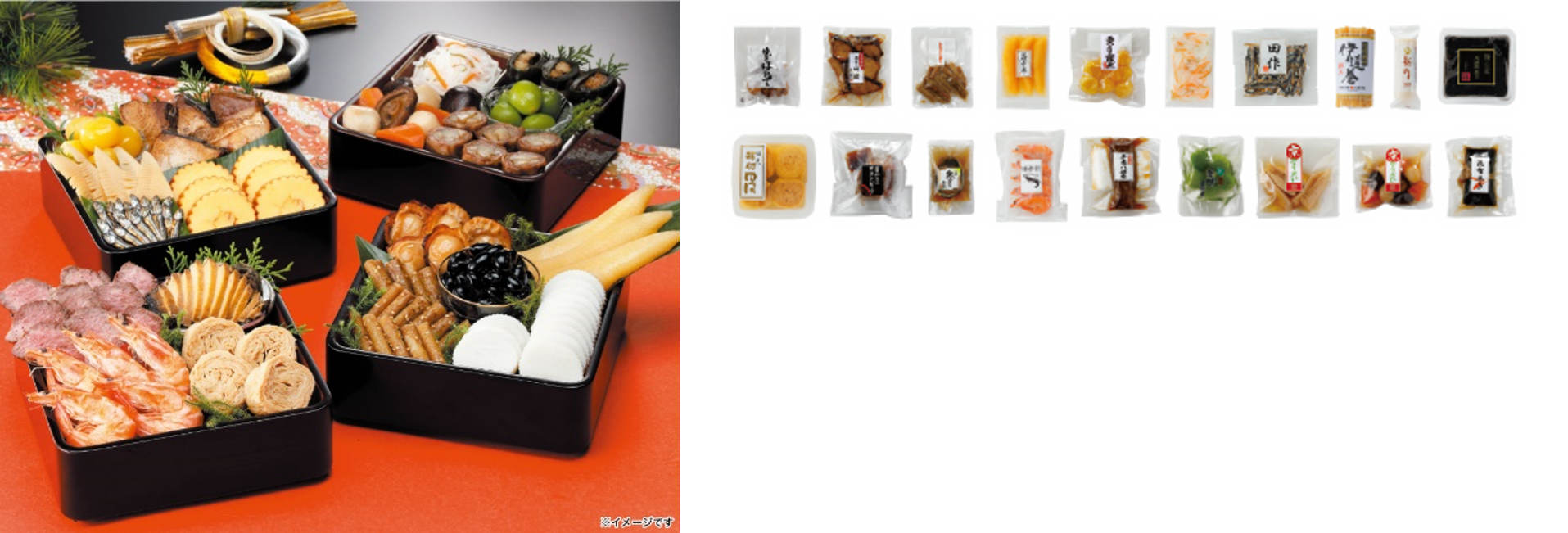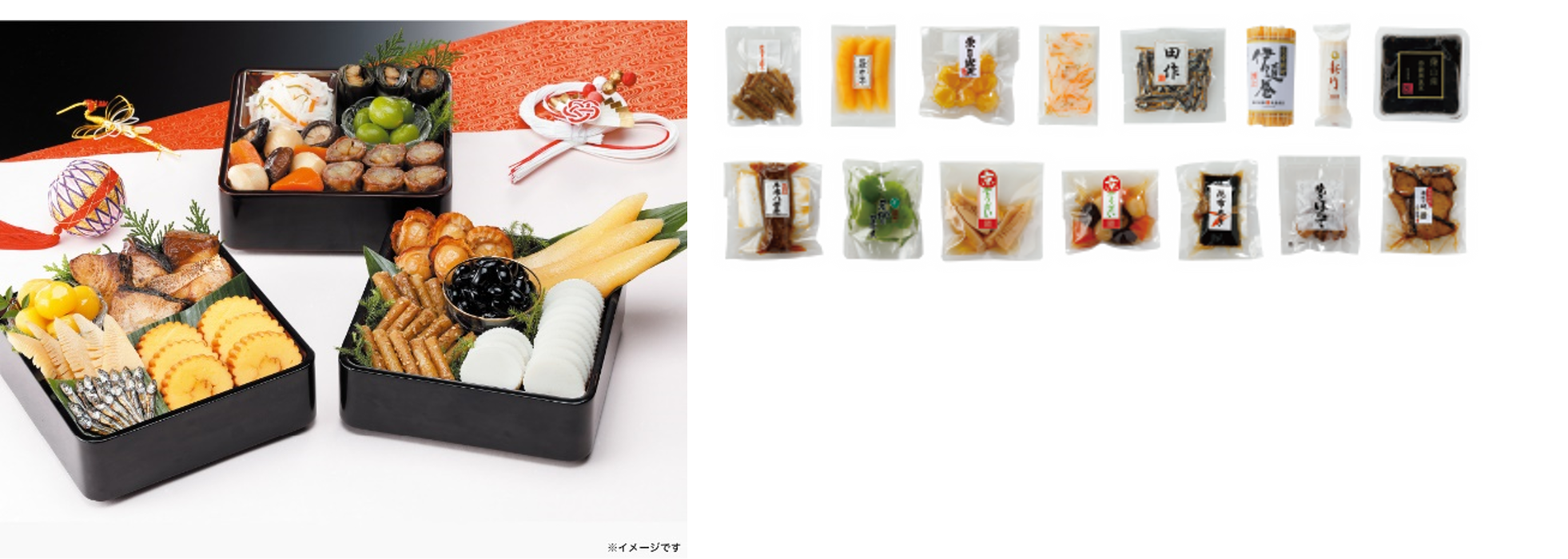 当社の「千年だしつゆ」を使用した京のお煮しめや卵がぎっしり詰まった一本羽を使った北海道小樽産味付け数の子など、全15品。