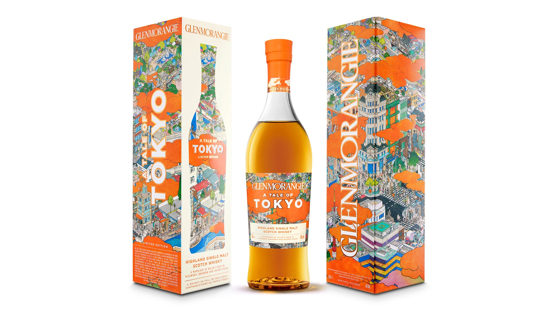 このたび新たに誕生した刺激的で大胆な風味と柔らかな甘さを併せ持つ「グレンモーレンジィ トーキョー」は、東京そのものと同じように、美味しい感覚のコントラストに満ちたシングルモルトウイスキーです。バーボン樽とシェリー樽の両方で熟成させたグレンモーレンジィに、希少なミズナラオークの樽のユニークで大胆な風味を調合させることで、東京の持つさまざまな魅力を凝縮したウイスキーが誕生しました。このウイスキーの味わいをパッケージで表現すべく、日本を代表する画家 山口晃氏とのコラボレーションが実現しました。東京の豊かな歴史と文化を遊び心溢れる視点で表現し、グレンモーレンジィの特徴であるオレンジ色の色彩で紡がれた鮮やかなアートワークに仕上げています。