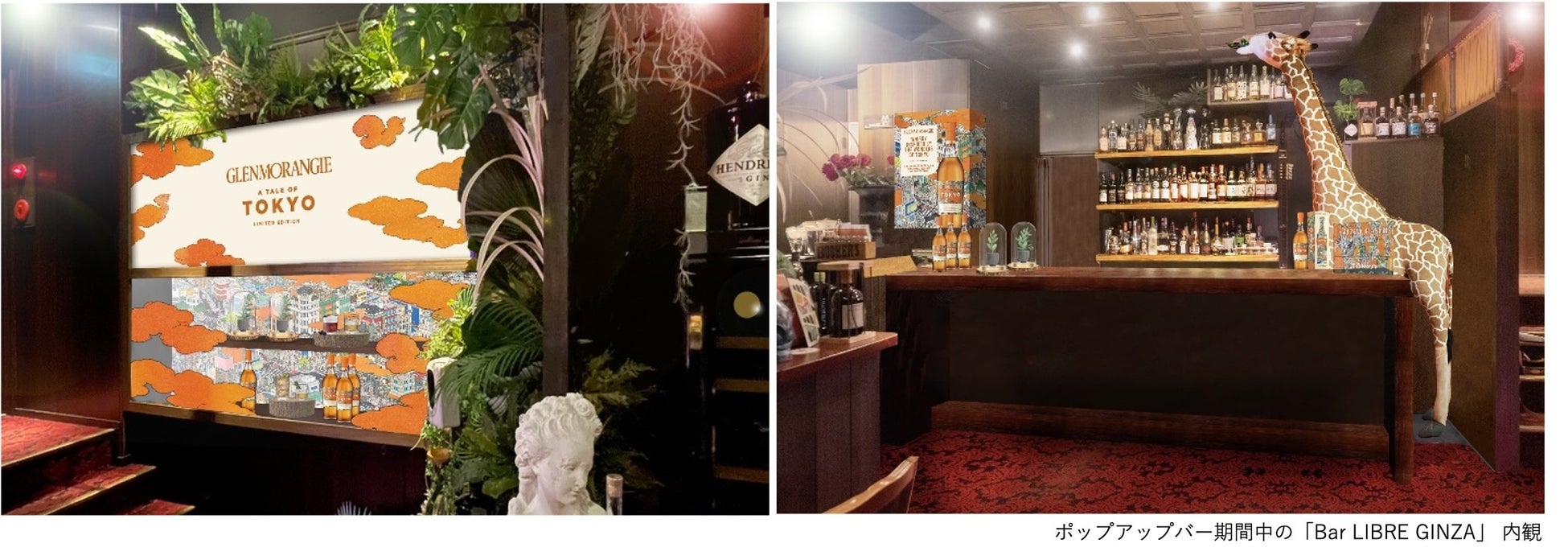 期間限定ポップアップバーが開催される「Bar LIBRE GINZA」では、「グレンモーレンジィ トーキョー」の味わいが表現されたギャラリーが展示され、バーカウンターではブランドのシンボルであるキリンがゲストを迎えます。また、山口晃氏によるパッケージデザイン画に”ハイチーズ”と書かれたポップなネオンサインもフォトジェニックに店内を飾ります。