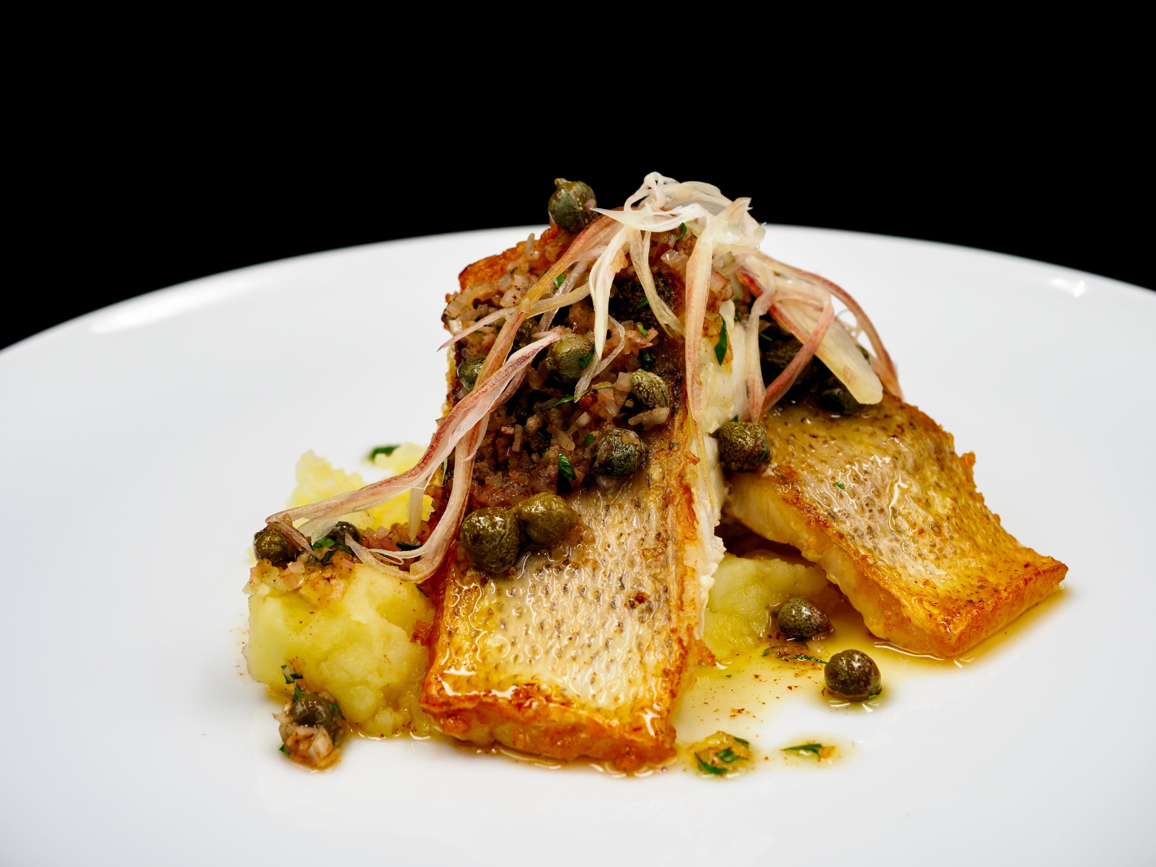 皮目はパリッと、身はふっくらとなるように焼き上げたスズキにケーパーと焦がしバターのソースを合わせ、茗荷のピクルスを添えました。