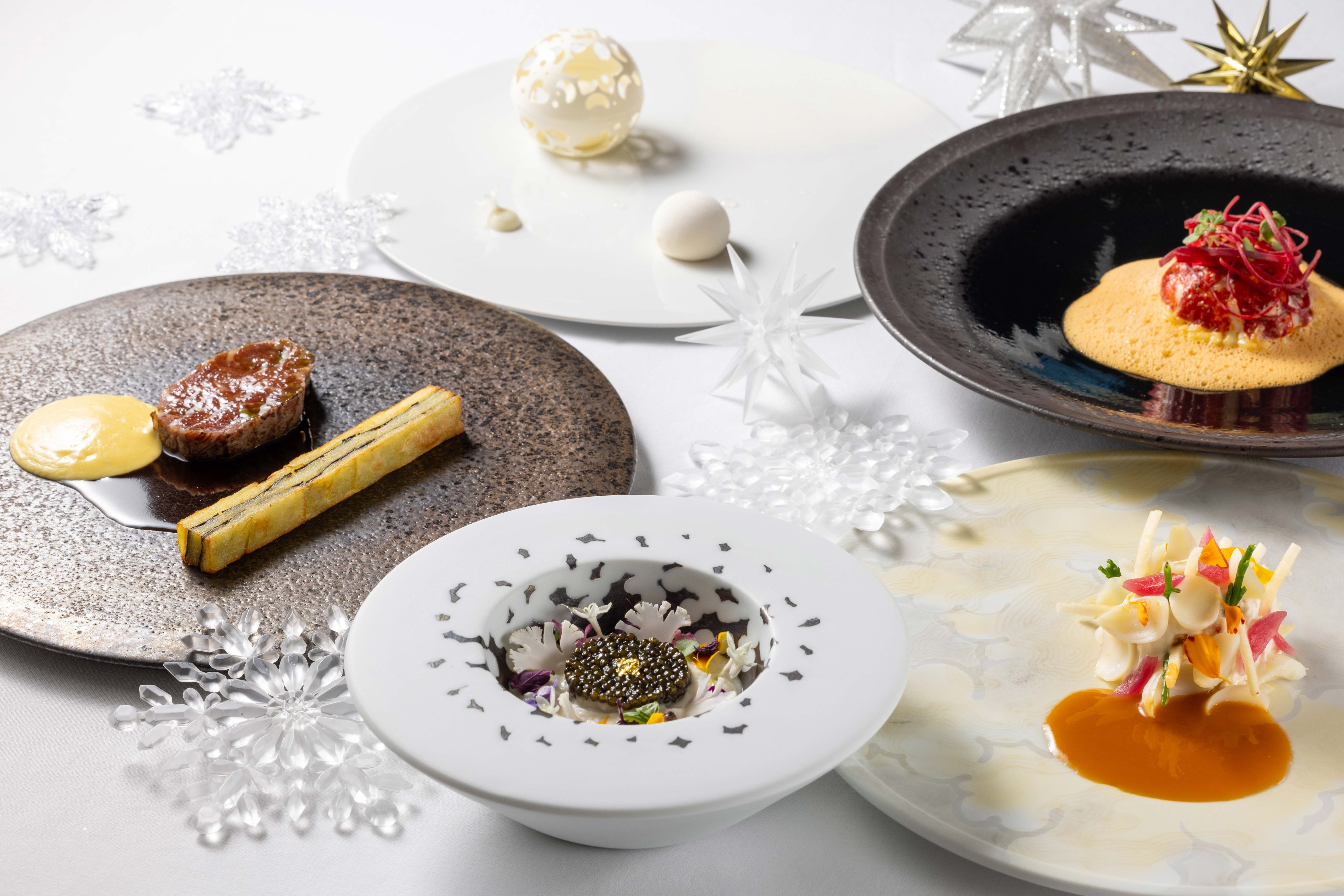 毛蟹やクエなど日本各地の冬の素材の持ち味を引き出し、伝統的なフレンチの手法を大切にしながらも、お客さまに驚きや感動を届ける創造性を織り込みました。あきたシャポンやキャビア、トリュフなどクリスマスの特別感を演出する素材も使用し、リースを模った前菜や銀世界をイメージしたデザートなど、一皿一皿に華やぐ季節を表現した限定コースです。