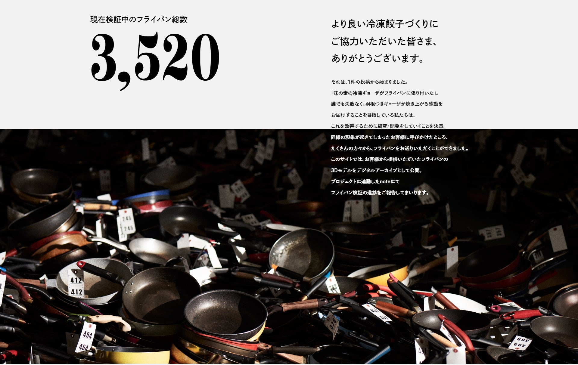 その結果3日間の募集で、全国47都道府県より総計3,520個ものフライパンが届きました。フライパンをお送りいただいた皆さま、募集の情報をシェアしていただいた皆さまからの「ギョーザ」への期待に応えるため、『冷凍餃子フライパンチャレンジ』プロジェクトを立ち上げました。