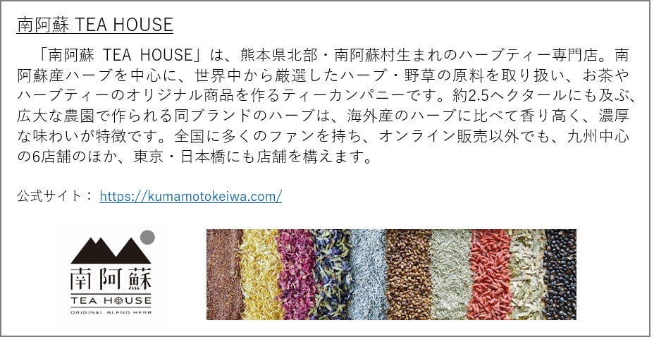サステナビリティ活動や地元の雇用創出への積極的な取り組みなどを行う「南阿蘇 TEA HOUSE」の理念と、再春館製薬所が目指す「自然、人とのつながり」という考え方が軌を一にすることで実現した今回のコラボレーション。両社が拠点を構える熊本県産の素材を多く採用しながら、その試みは「地元素材を使ったブレンド茶の開発」という枠にとどまらず、両社の理念の有言実行として、アップサイクル(創造的再利用)の素材なども積極的に採用しています。