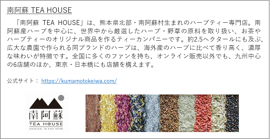 サステナビリティ活動や地元の雇用創出への積極的な取り組みなどを行う「南阿蘇 TEA HOUSE」の理念と、再春館製薬所が目指す「自然、人とのつながり」という考え方が軌を一にすることで実現した今回のコラボレーション。両社が拠点を構える熊本県産の素材を多く採用しながら、その試みは「地元素材を使ったブレンド茶の開発」という枠にとどまらず、両社の理念の有言実行として、アップサイクル(創造的再利用)の素材なども積極的に採用しています。