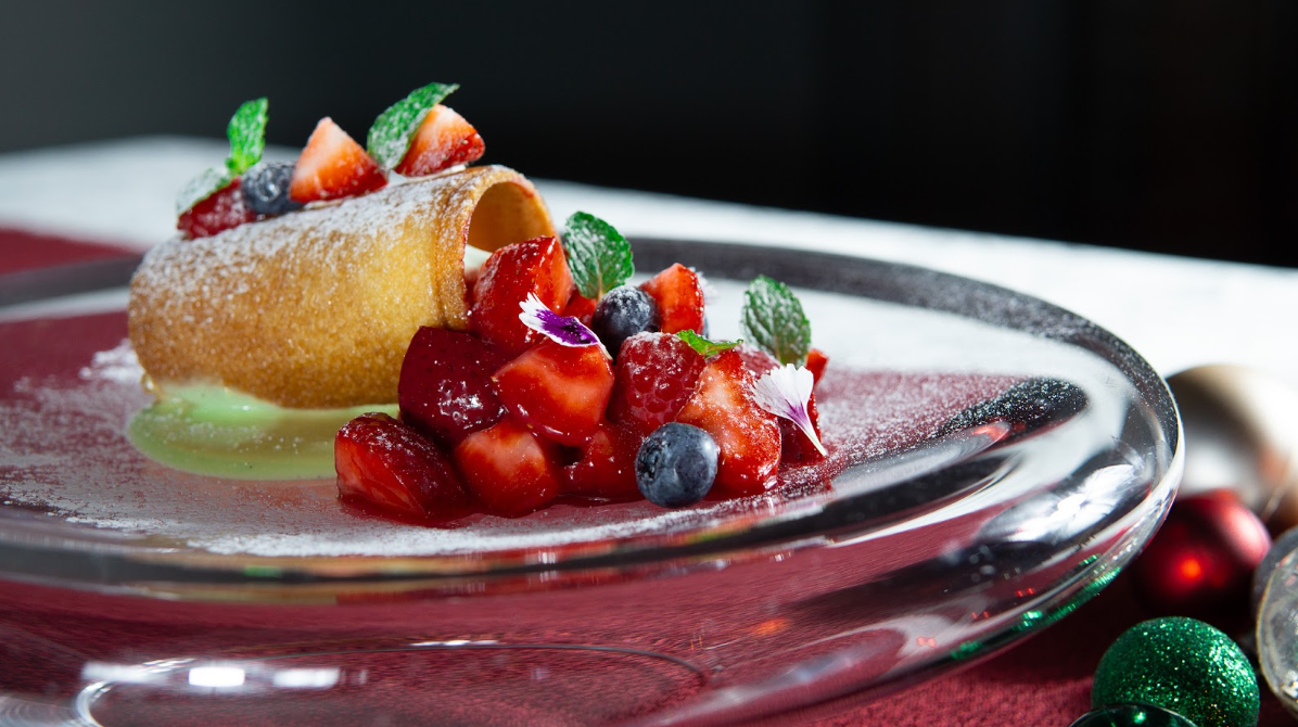 丸太をイメージしたラングドシャの中からは、ピスタチオのムースとバニラアイスが顔をのぞかせます。可愛くカットしたイチゴをふんだんに使用し、ラズベリーとピスタチオのソースとともに盛り付けた、森の恵みを色鮮やかに表現した期間限定クリスマスデザートです。