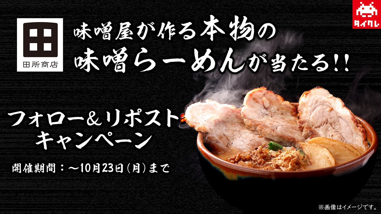 タイクレX(旧Twitter)アカウントにて、「田所商店“本物の”味噌らーめんをプレゼント!フォロー&リポスト(旧リツイート)キャンペーン」を開催いたします。詳細はキャンペーン開始後タイクレ内お知らせ欄をご確認ください。