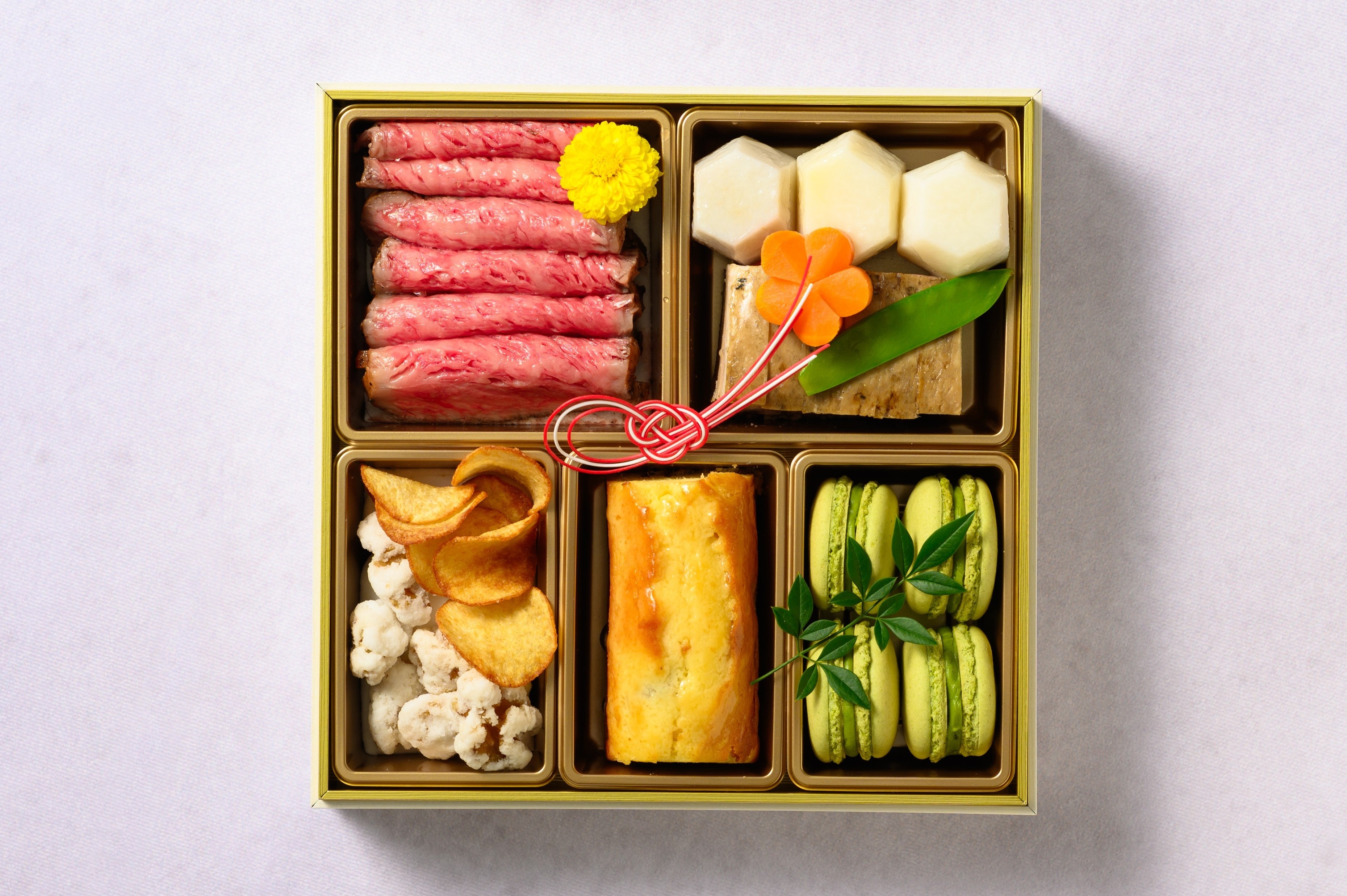 和牛ローストビーフ/飛騨豚角煮/里芋白煮/胡桃糖/慈姑チップス/純米吟醸《百十郎》パウンドケーキ/揖斐抹茶マカロン