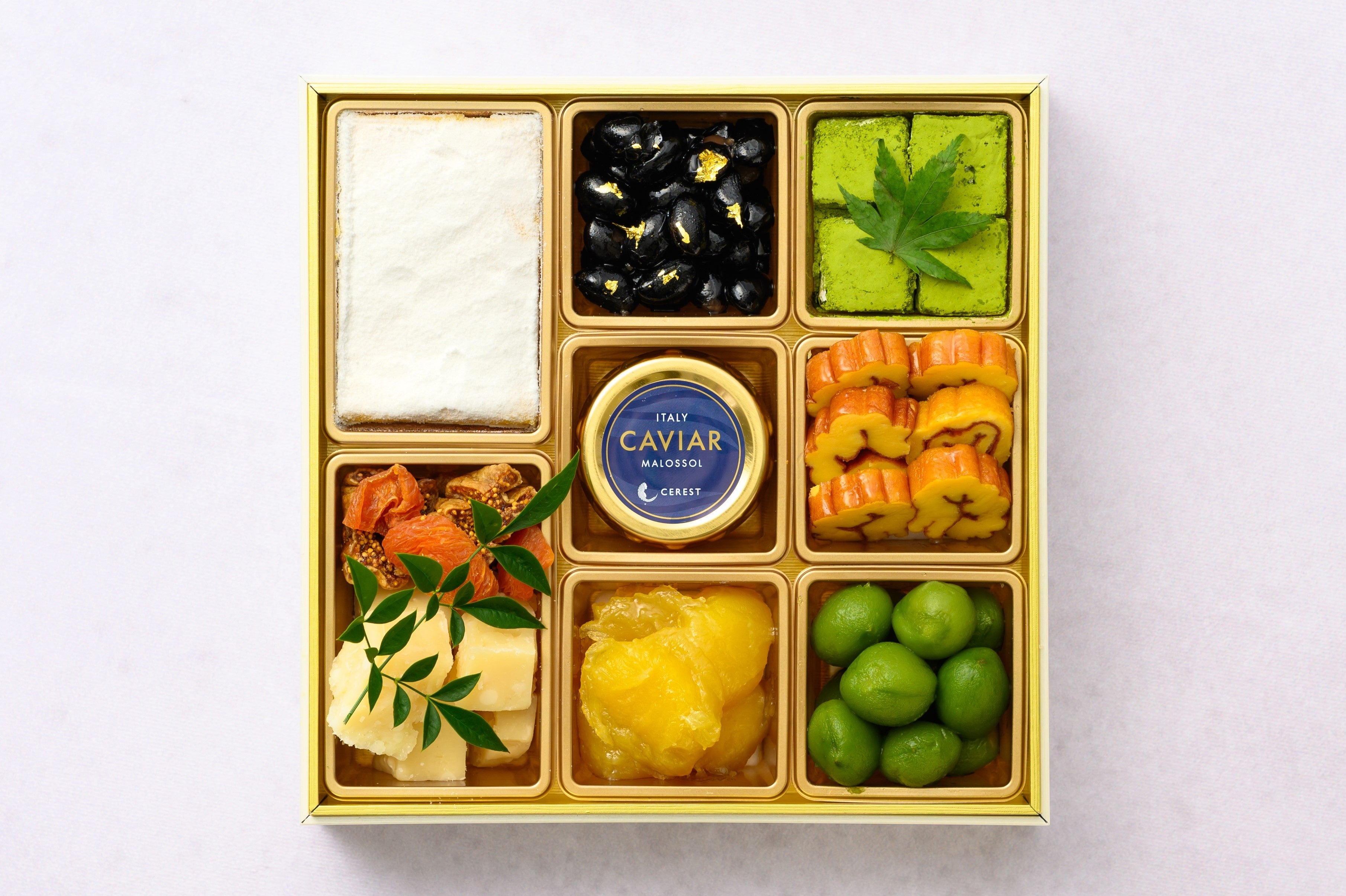 4種チーズのベイクドチーズケーキ/栗きんとん/イタリア産キャビア/宇治抹茶の生チョコレート/パルミジャーノ・レジャーノ/セミドライフルーツ/丹波ぶどう豆 赤ワイン味/若桃甘露煮/メープル香る伊達巻