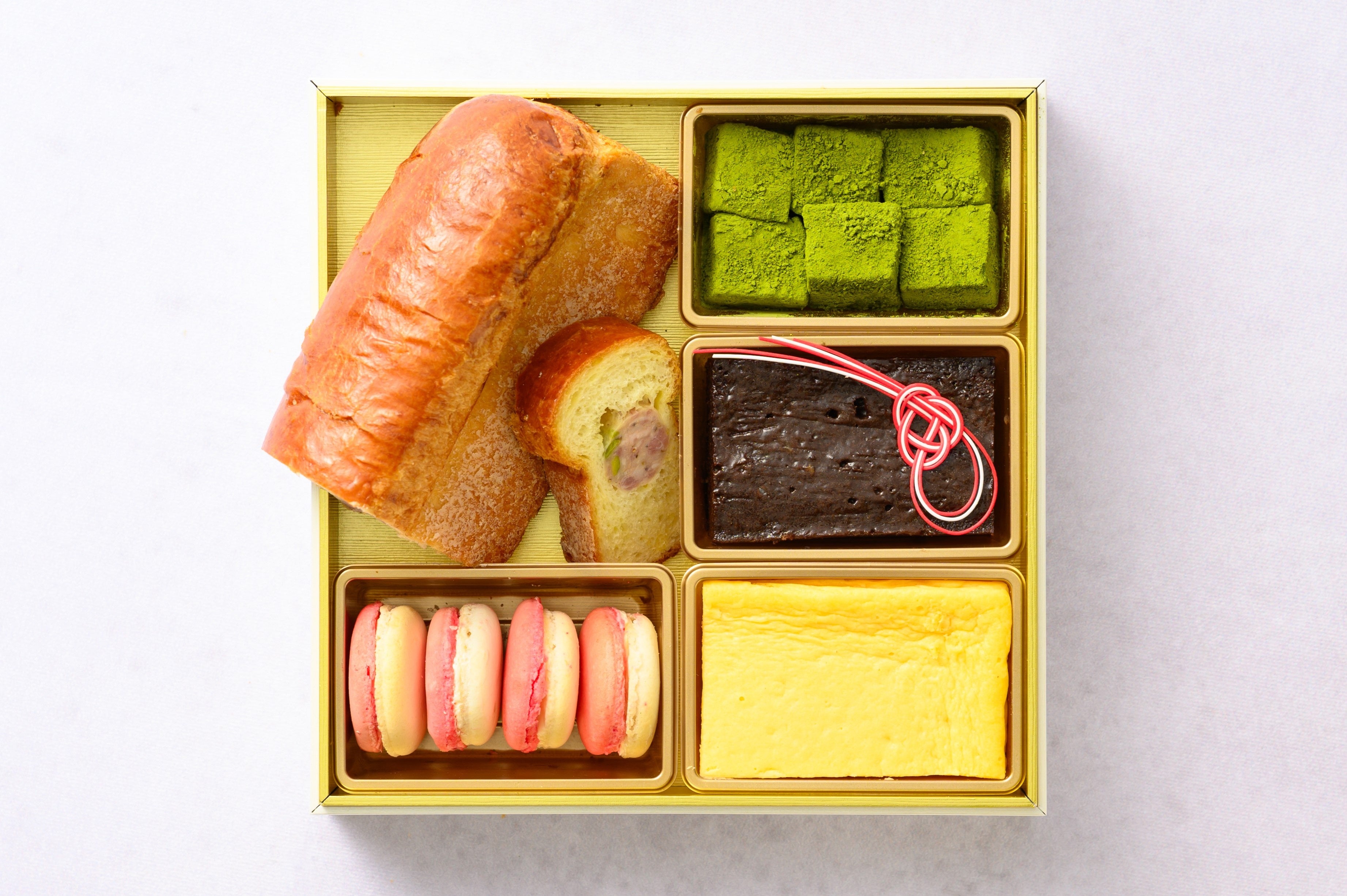 紅白マカロン/イベリコ豚ソーセージブリオッシュ/ベルギー産チョコレートブラウニー/ニューヨークチーズケーキ/抹茶のわらび餅