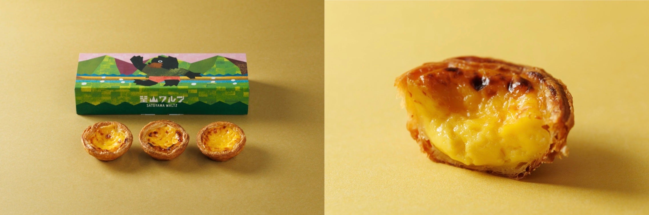里山ワルツは、日本の里山をテーマに、各地にあるおいしい “里山そざい”がふんだんに味わえるタルト専門店です。今回は、天然湧⽔が流れる⼭梨百名⼭の麓で、のびのびと鶏たちを育てる「⿊富⼠農場」直送の、濃厚でコクのある平飼い放牧卵を使⽤。しあわせな鶏たちから育まれた⽢さ引き立つ卵⻩に、⽜乳と⽣クリームを贅沢に合わせ、卵の旨味がじゅわ〜と広がるクリームブリュレのような究極のフィリングがたまらない逸品です。