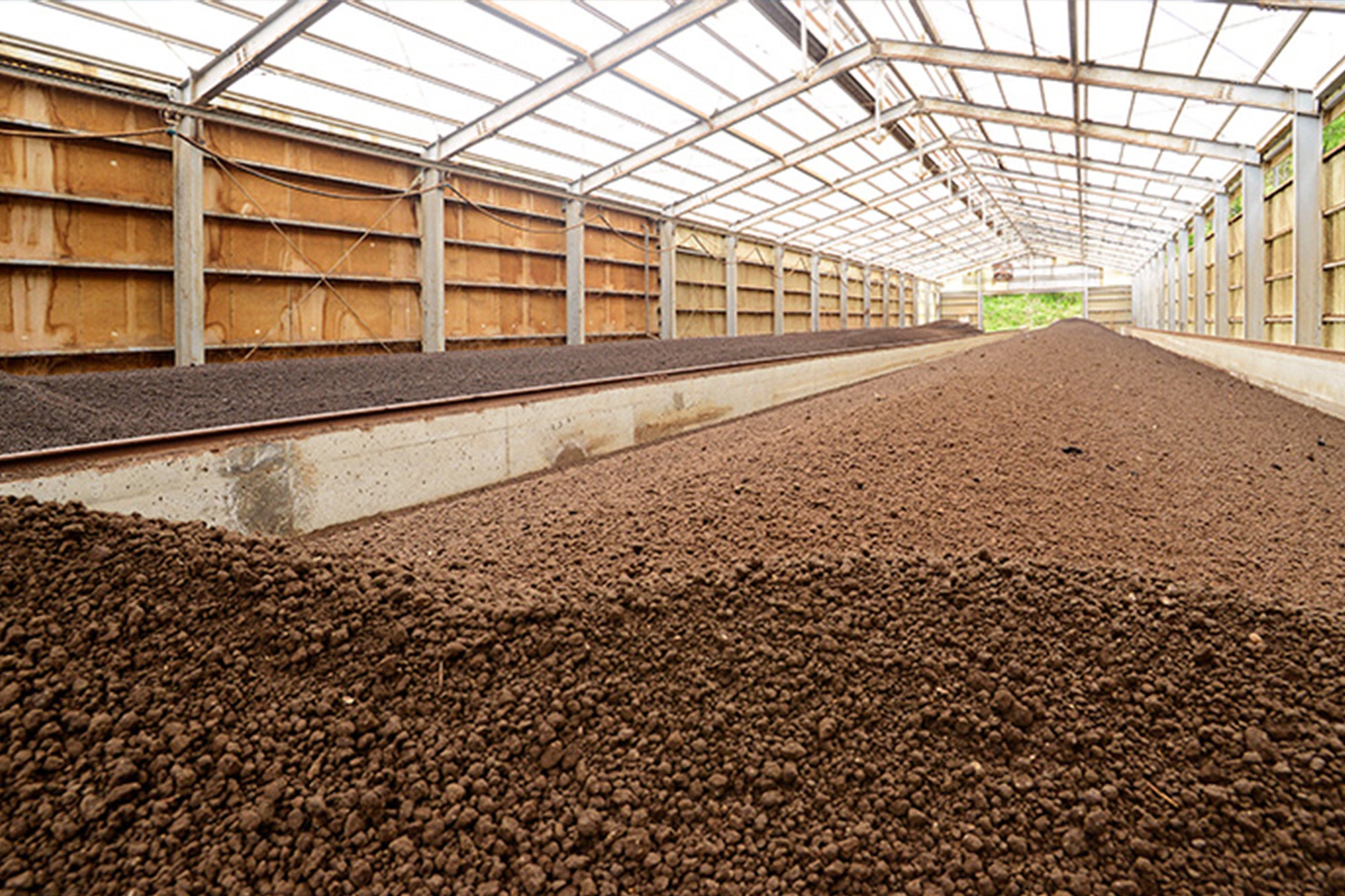 天然湧水とともに、おいしい卵を生み出すために大切な飼料は、遺伝⼦組換えの原料を極力使用しない分別管理方法を行っているほか、飼料の一部には「エコフィード」と呼ばれる、近隣の企業や農家から集めた、おからや⽶ぬかなどの未利⽤資源も使⽤しています。また、農場内に堆肥センターを設置することで鶏から排泄される糞尿を分解し、堆肥として再利用。使⽤しきれない⼟は、⾃社の飼料⽤の畑や近隣の有機農家で活⽤してもらう取組みも。鶏がいることによって本来廃棄されるはずだったものを良質な堆肥へと変え、地域へと循環させています。