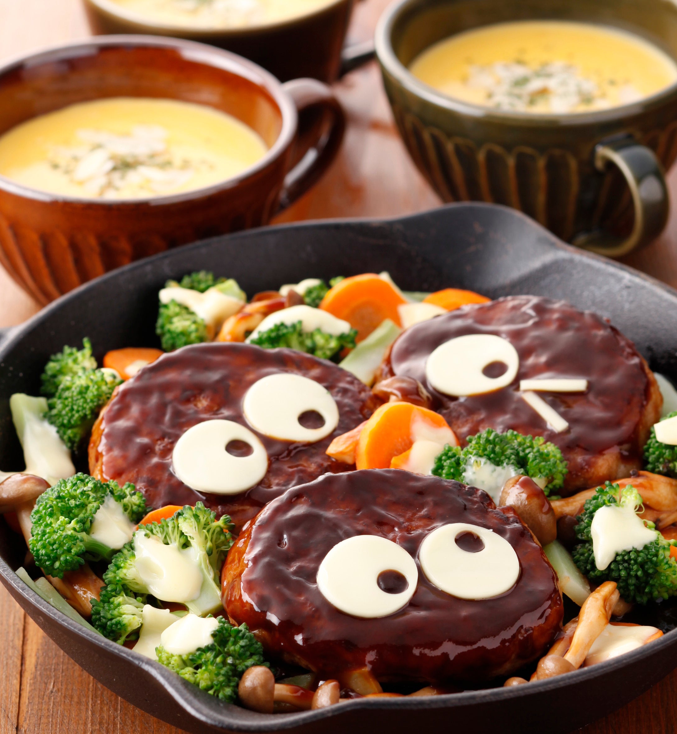 みんな大好きなハンバーグに目をつけて、ハロウィン仕様にしてみました。目をつけるだけでもグッと雰囲気が出て、お子さんにも喜んでいただけると思います!素材の味を活かしたかぼちゃスープも、ぜひ試してみてください。