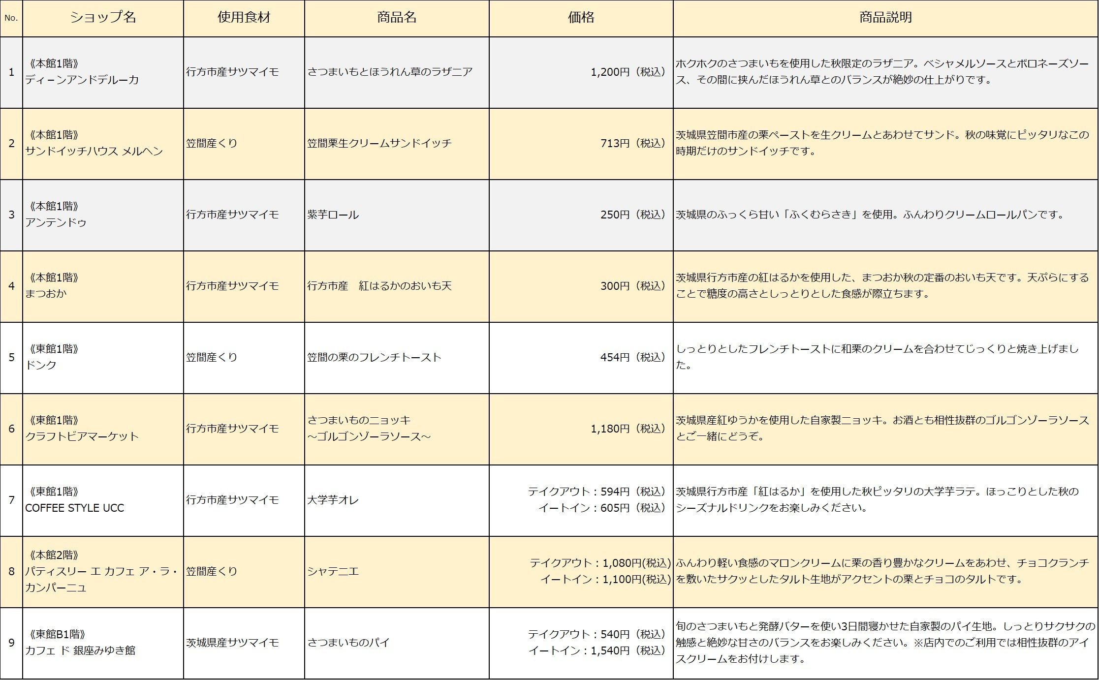 フェア期間中、対象ショップにて茨城県産の「さつまいも」「くり」を使用した限定商品を販売します。