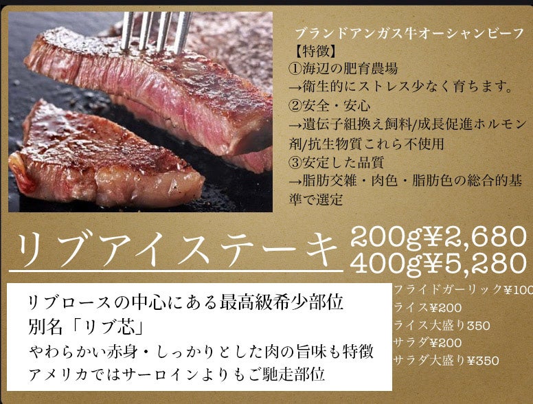 リブアイステーキはやわらかい赤身・しっかりとした肉の旨味が特徴のアンガス牛オーシャンビーフです。