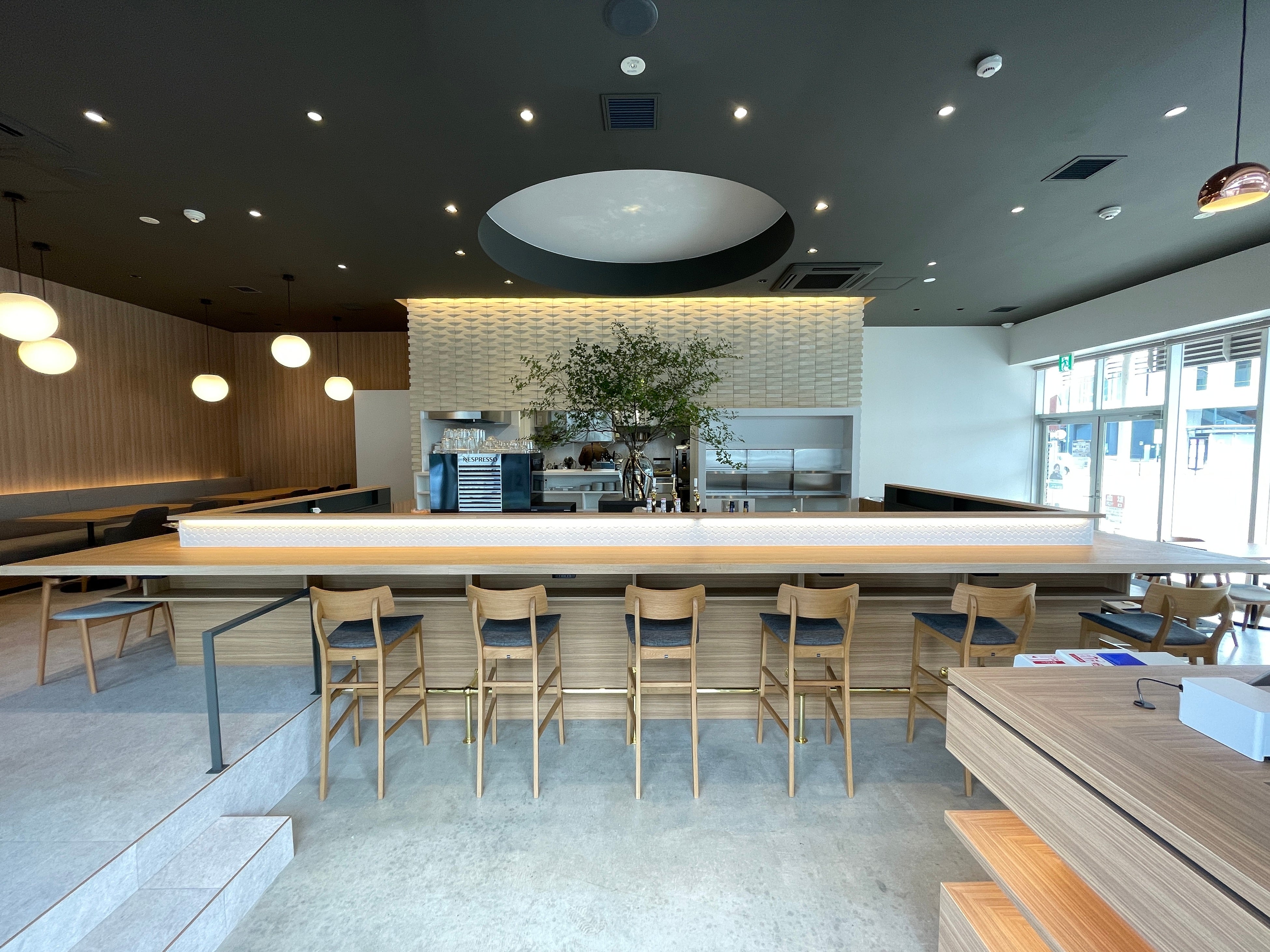 お店に訪れるお客様のみならず、店舗の前を通る住民の方にも季節の移ろいを感じて頂きたい思いから、ガラス張りの店内中央に、月ごとに替わるシンボルツリーを立てました。また、隣の人とのふとした会話が生まれるように、カウンター席はこのツリーを囲むようにしつらえています。