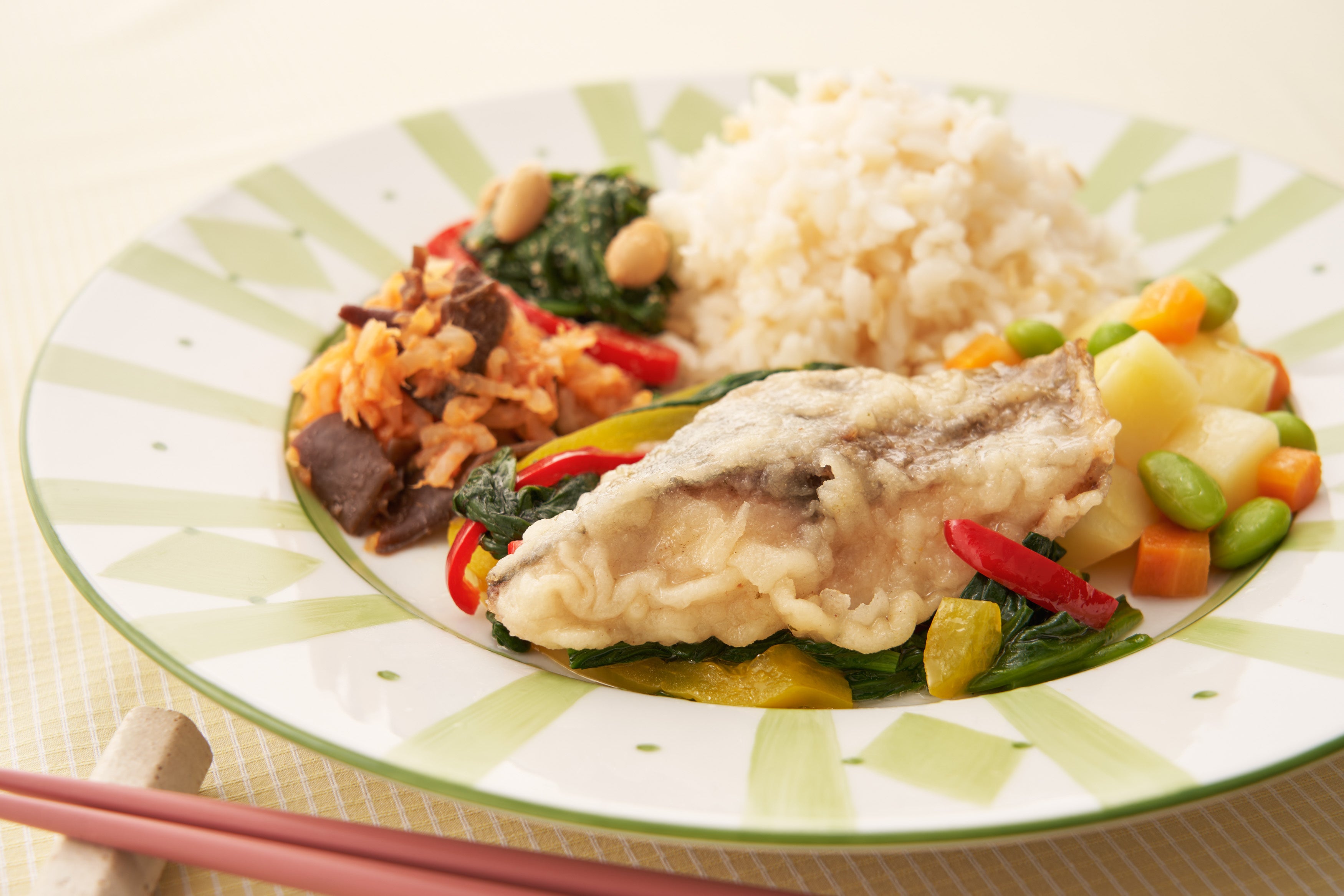 身が厚くてボリューム満点なアジに、オリジナルブレンドの衣を付けてフリットにしました。ソースにも副菜にもお野菜がふんだんに使用されているので、お魚や野菜不足の方に特におすすめしたい一品です。