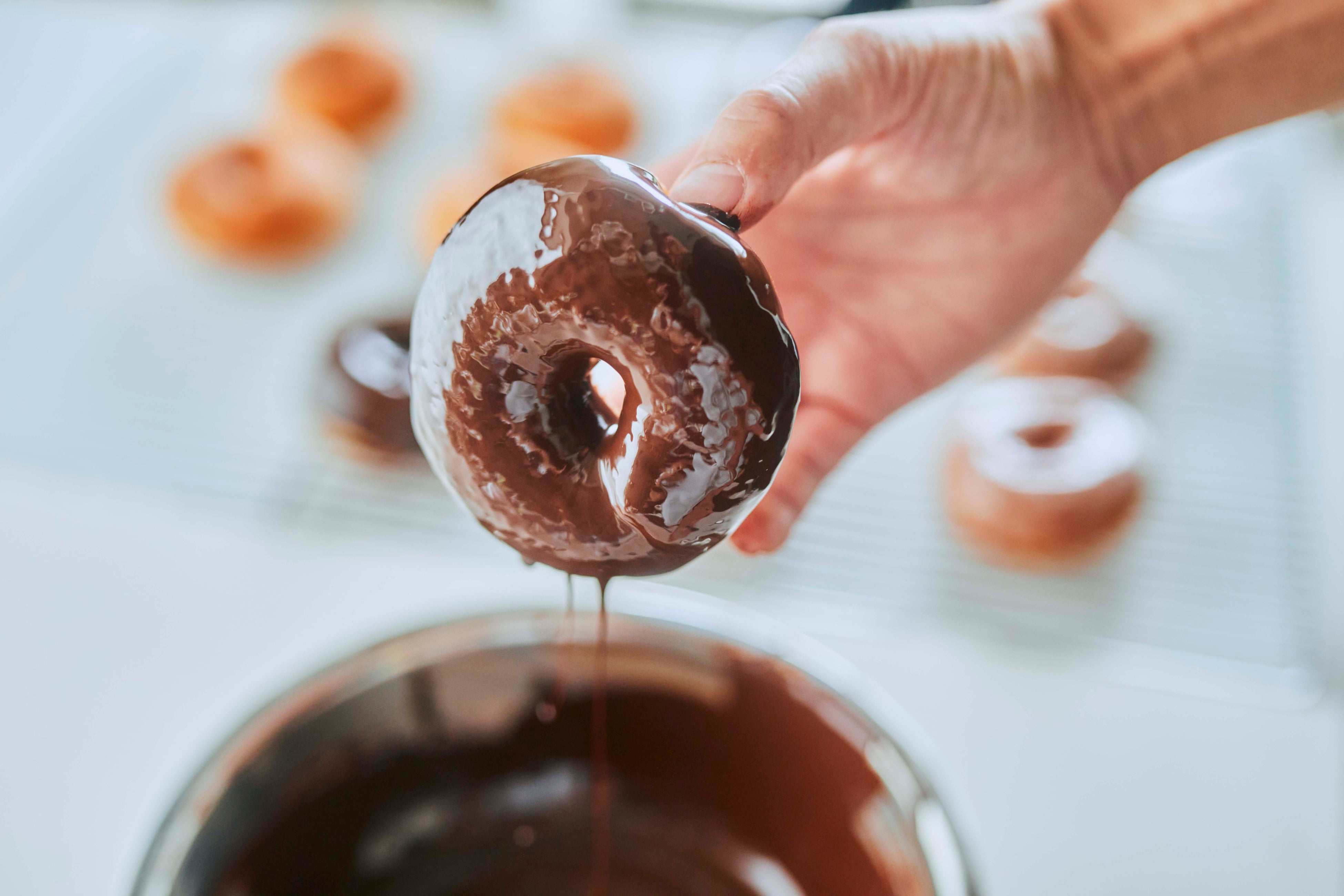 オイル、生地、クリームに、チョコレート、どれも植物性の100%ヴィーガンドーナツ。シンプルながらこだわりの素材を使用し、ヴィーガンとは思えない豊かな味わいを表現しました。シグニチャーとなるチョコレートドーナツは、コロンビアに構える自社管理農園のカカオから作る、香り高いビターチョコレートを使用しています。生地の発酵を見極め、揚げ方を追求することで、軽くてもっちり、食べ応えのあるドーナツに仕上げました。