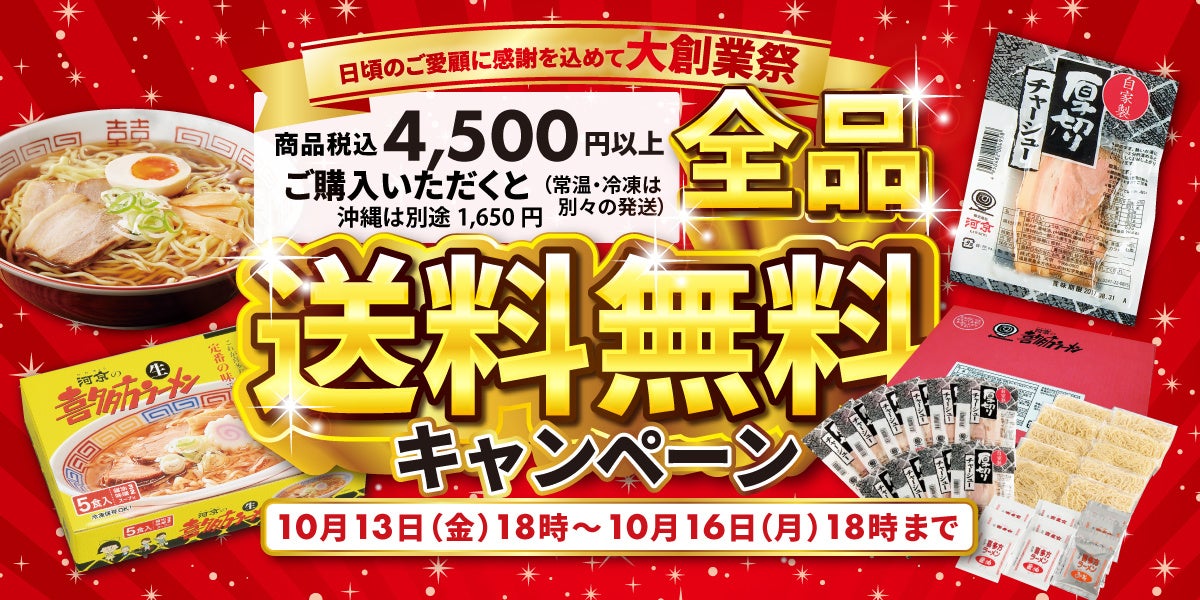 株式会社河京(本社:福島県喜多方市、代表取締役:佐藤健太郎)は、2023年10月16日(月)18時まで大創業祭としまして、送料無料キャンペーンを開催中です。