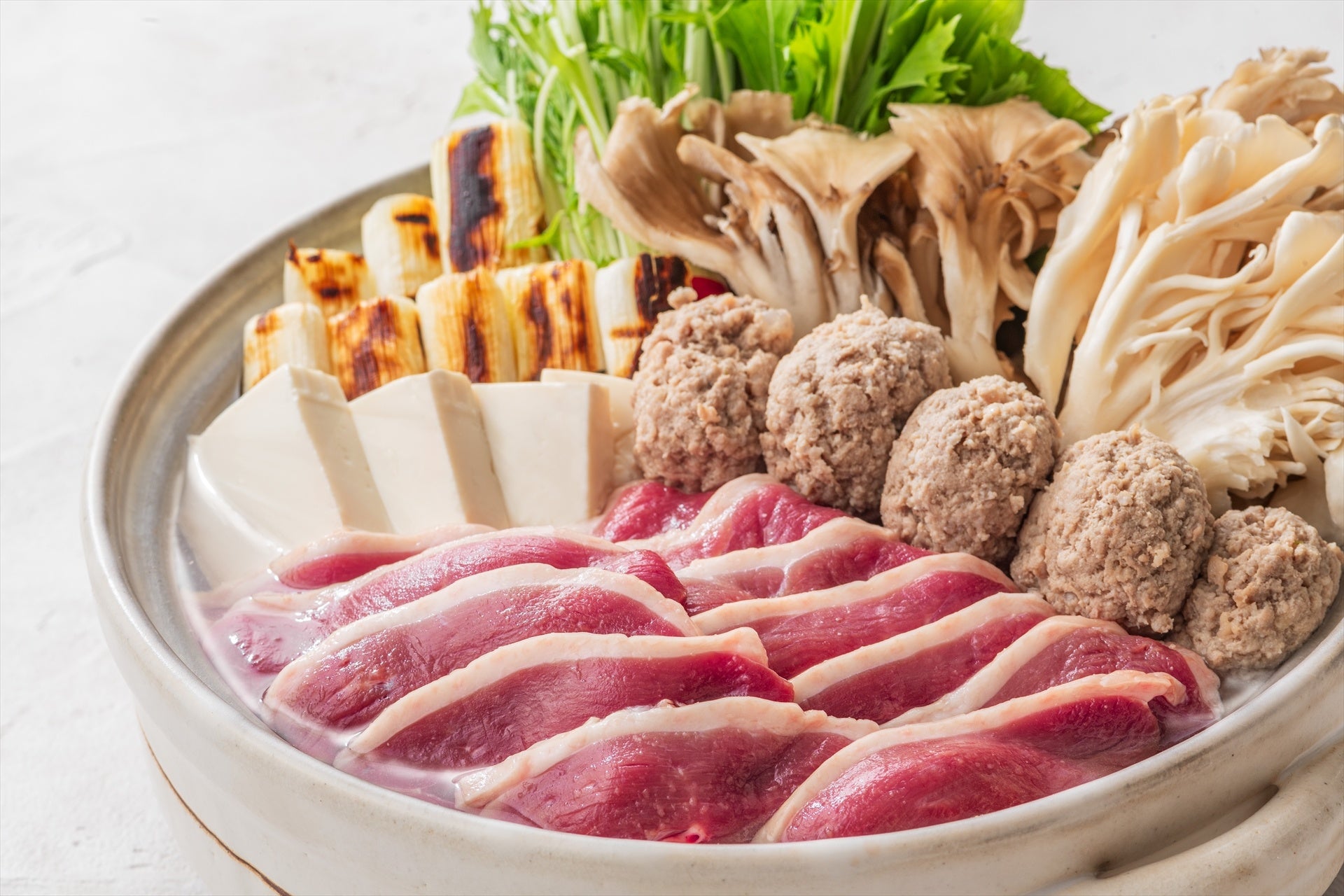 国産あい鴨の中でも最高級の京鴨と、京鴨肉100%の粗挽き鴨つくね(味付き)、鴨鍋のために開発した梅やオリジナルの鍋つゆが入ったセット。ご自宅で本格的な鴨鍋をお楽しみいただけます。