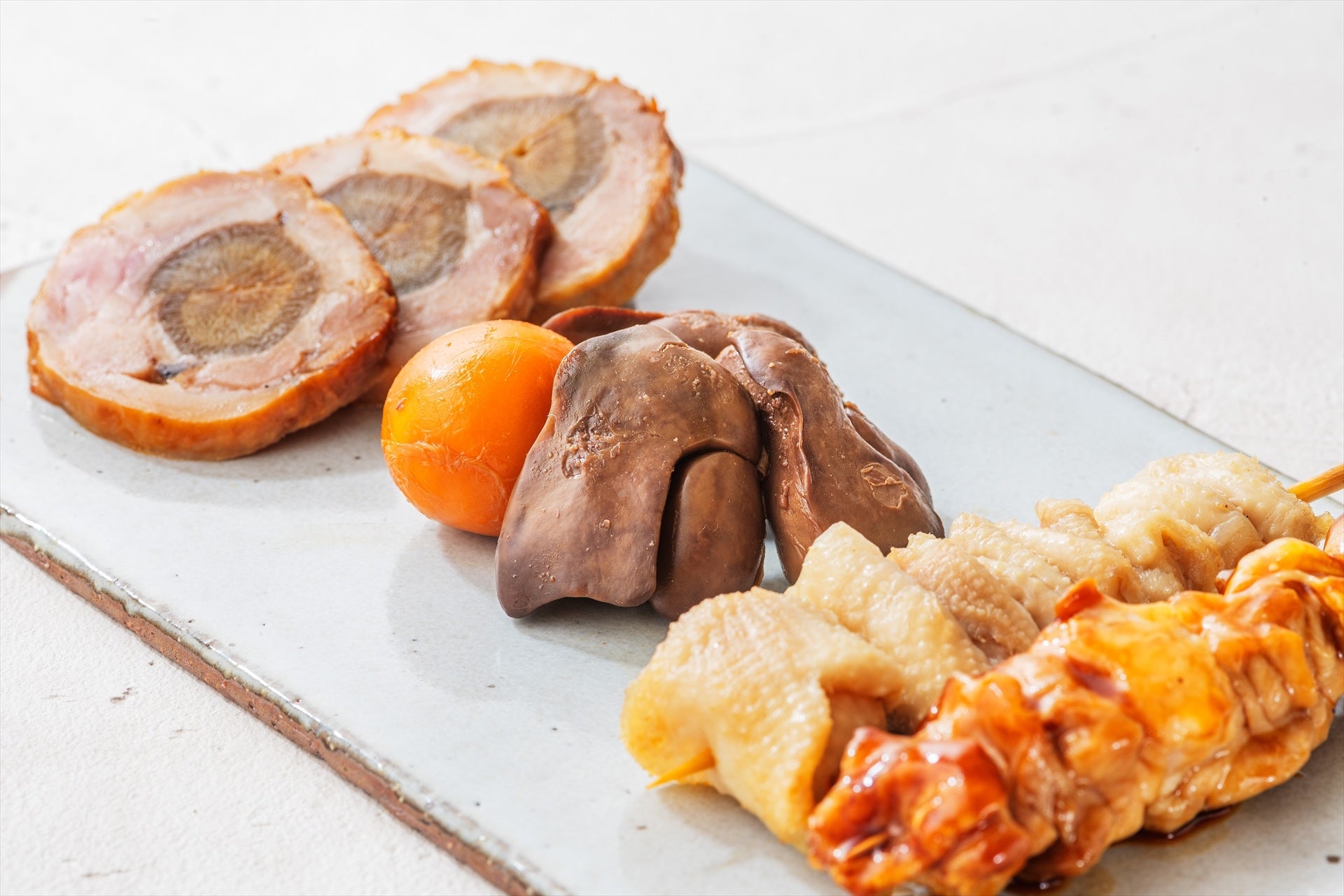 焼き鳥盛合せ、ごぼう巻き、鶏チャーシュー、鶏肝のしぐれ煮など