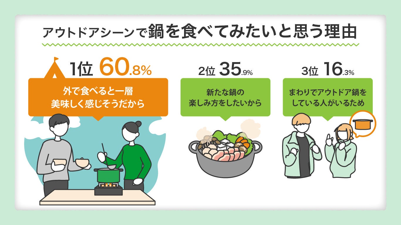 「アウトドア鍋」を「食べたことはないが、今後食べたい」あるいは「食べたことはないが、少し興味はある」と回答した人は49.8%にのぼり、2人に1人の人は「アウトドア鍋」を食べてみたいと思っていることがわかりました。理由の第1位は「外で食べると一層おいしく感じそうだから」(60.8%)という結果となり、室内では味わうことができない、外ならではの鍋のおいしさが、「アウトドア鍋」が注目されている理由の一つであることが判明しました。