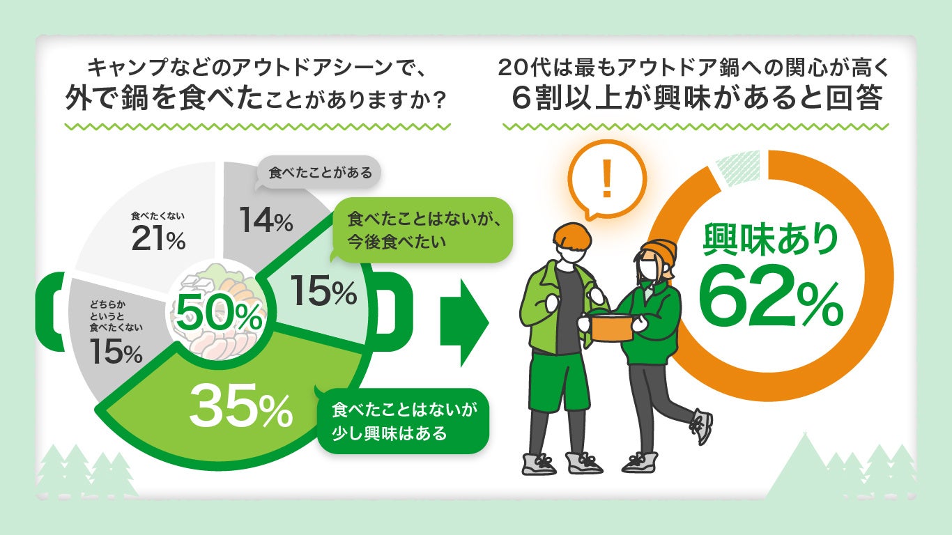 年代別で見てみると、20代で「食べたことはないが、今後食べたい」あるいは「食べたことはないが、少し興味はある」と回答した人が6割を超え、「アウトドア鍋」の注目度の高さがうかがえました。