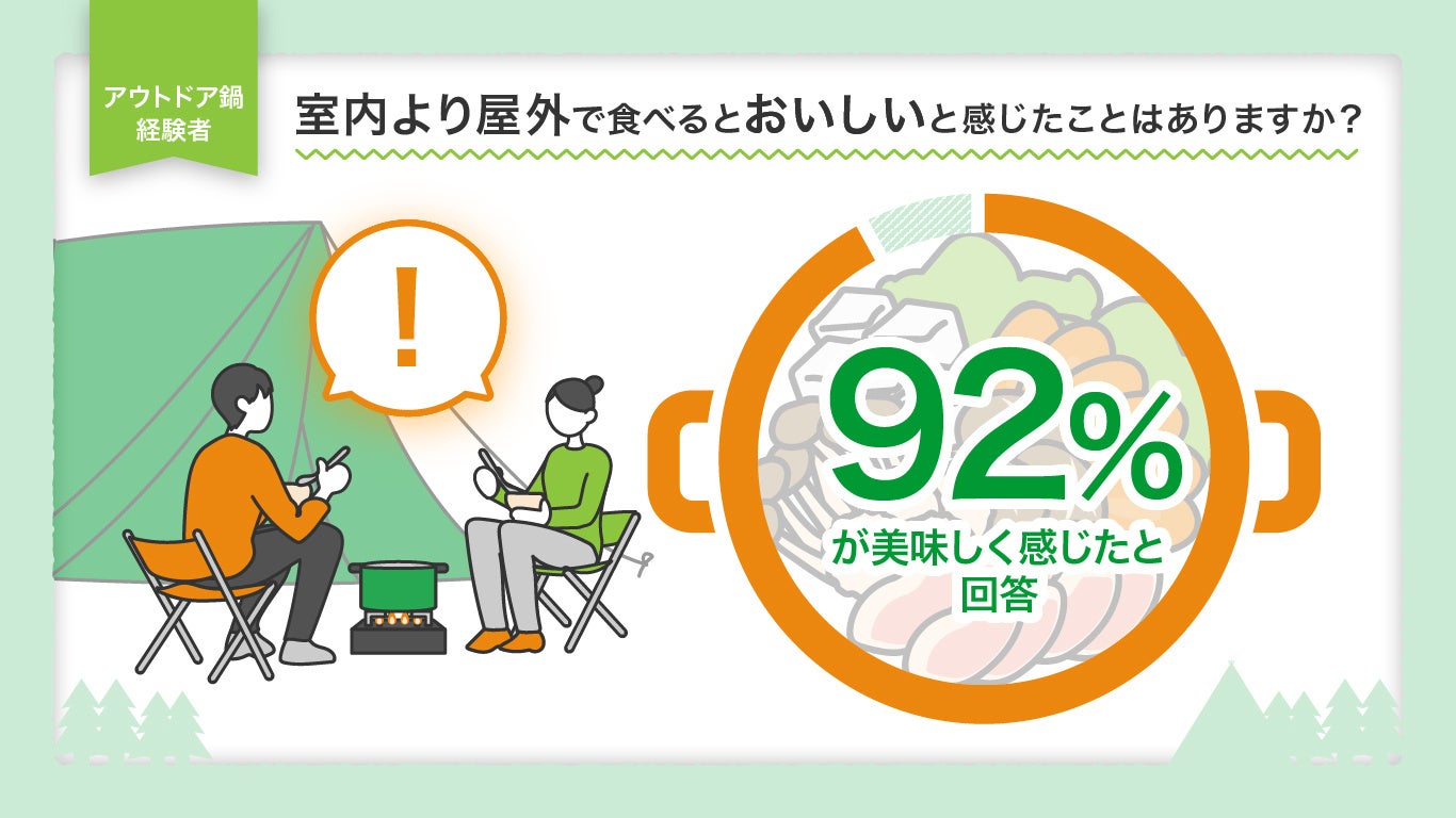 ① 9割以上の「アウトドア鍋」の経験者が、室内より屋外で食べると、よりおいしいと感じたことが判明。 |