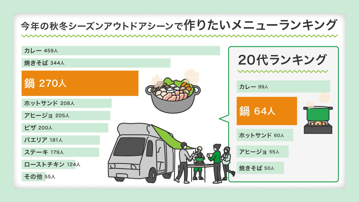 さらに世代別では、20代で1位の「カレー」(49.5%)に次いで、2位に「鍋」(32.0%)がランクインし、より「アウトドア鍋」にチャレンジしたい傾向があることが、わかりました。