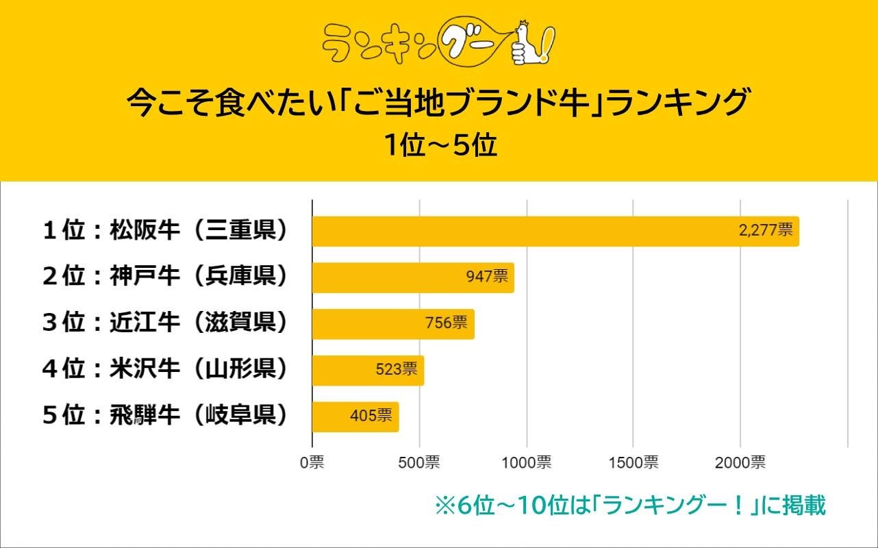 三重県の松坂牛が2位に2倍以上の票差をつけて圧倒的1位に。2位神戸牛以下も票数の差が大きく、各地のブランド牛については人気や知名度に大きな差があることが感じられる結果になっています。