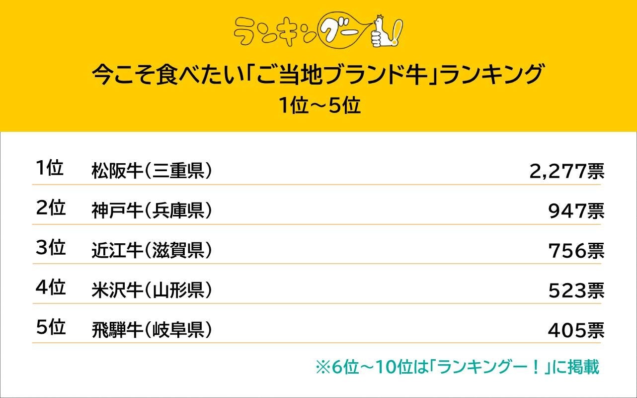 調査方法:株式会社CMサイトがインターネットリサーチした<今こそ食べたい「ご当地ブランド牛」ランキング>のアンケート結果を集計。