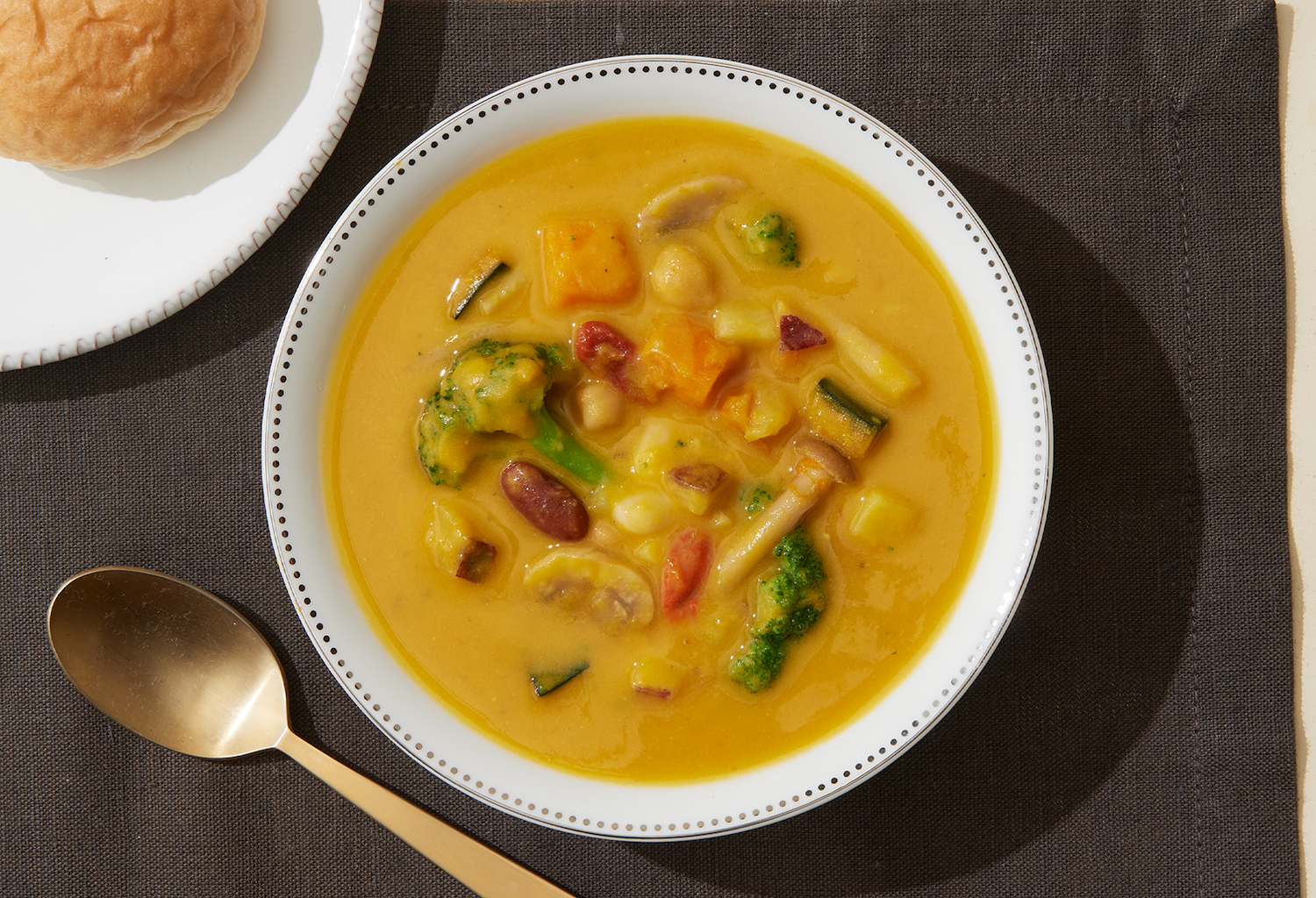食物繊維たっぷりの野菜がとれるだけでなく、体も温めてくれるスープは、腸活や食生活改善をしたい方にも多く愛用されています。そんなスープの中で食物繊維がもっとも多いのは、かぼちゃとさつまいもの豆乳リッチポタージュ「Golden Hour」です(1包装240gあたりで 5.1g含有)。さつまいもやきのこ類などの食物繊維豊富な食材を、まろやかなポタージュとして味わうことができる商品です。