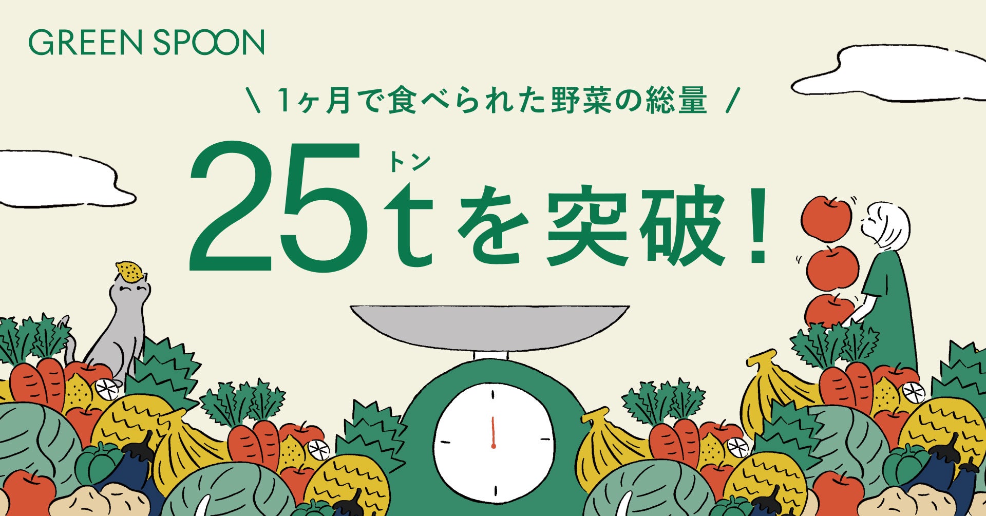 2023年8月31日(木)から2023年9月30日(土)までに公式サイトの定期プラン・単品プランで注文されたGREEN SPOON全商品(メインディッシュ、スープ、サラダ、スムージー)に含まれる野菜の合計量を集計した結果、約1ヶ月のあいだに合計25トン以上もの野菜を皆さまのもとにお届けしていることがわかりました。