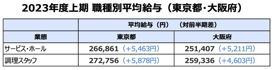 職種別平均給与額では、2022年度下期と変わらず、東京都・大阪府ともにサービス・ホールよりも調理スタッフの給与額が高い結果となりました。