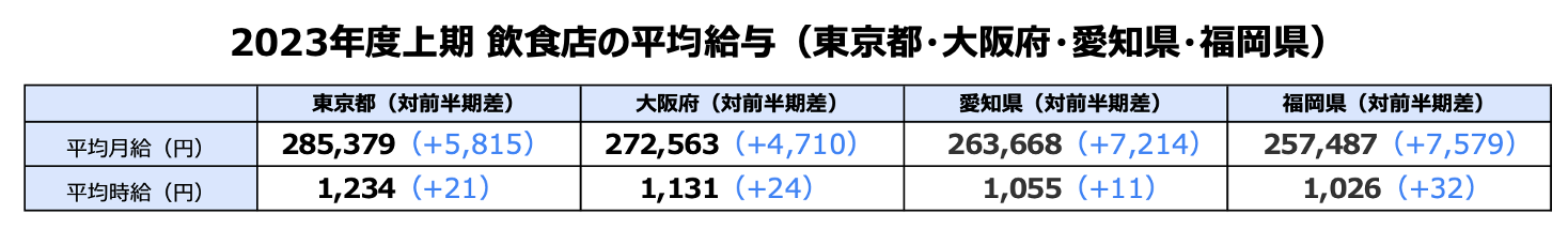 2023年度上期における飲食業界の平均月給について、東京都は285,379円で2023年度下期から5,815円上昇(前半期比102%)、大阪府は272,563円で同比+4,710円(前半期比102%)。また、愛知県は263,668円で同比+7,214円(前半期比103%)、福岡県は同比+7,579円で、257,487円(前半期比103%)という結果になりました。