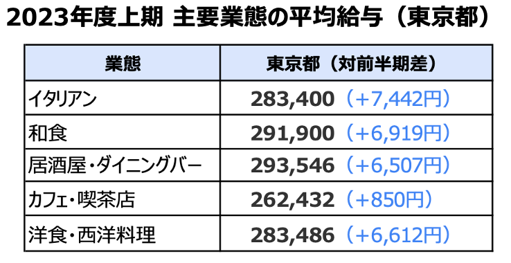 次に、求人飲食店ドットコムの主要業態である「イタリアン」「和食」「居酒屋・ダイニングバー」「カフェ・喫茶店」「洋食・西洋料理」の5業態において、東京での業態別の平均給与額を調査したところ、いずれの業態も2022年度下期から給与額が上昇しています。