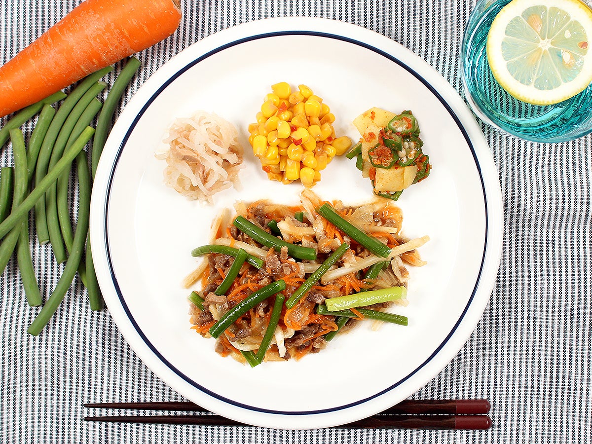 副菜は、ツナ入りの大根サラダ、トマトの入ったコーンの甘酢、オクラを入れたじゃがいもの辛味あえです。