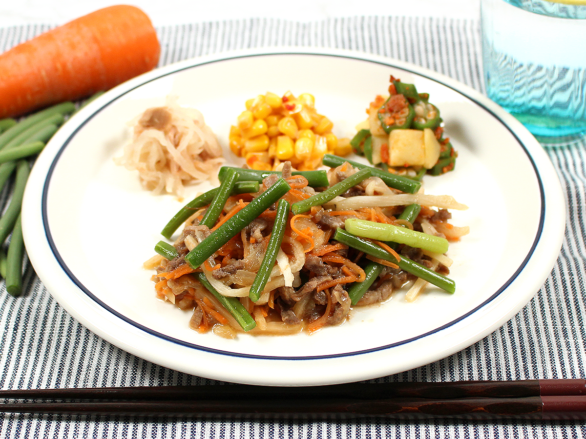 副菜は、ツナ入りの大根サラダ、トマトの入ったコーンの甘酢、オクラを入れたじゃがいもの辛味あえです。