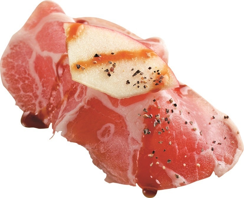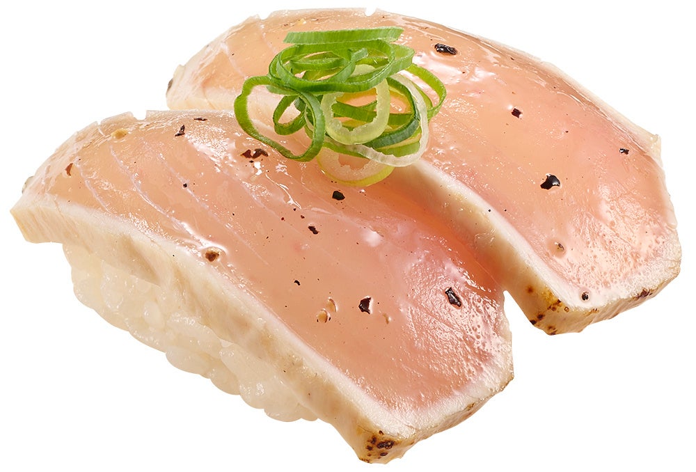 さらに、白皿の「本鮪中とろ」のほかにも、「復活してほしい」という“お客様の声をカタチに”した「復刻ネタ」をご用意しました。鮭ハラスの皮目を香ばしくあぶった、とろけるくちどけが贅沢な「あぶり鮭ハラス」や、生ハムの旨みと塩味、ガーリック香るソースと胡椒の風味、リンゴの甘みと酸味がマッチする「国産生ハムガーリック醤油」は、販売する度に好評をいただいております。他にも、びんちょうまぐろのたたきを特製塩だれで味付けした人気の一皿「塩だれびんちょう」や、鮮度抜群の活〆真鯛に濃厚なあん肝をトッピングした人気の「活〆真鯛のあんこう肝のせ」などもご用意しております。