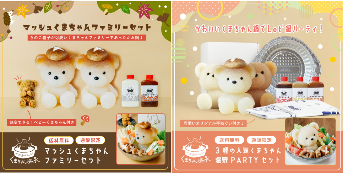 この度「北海道めんこい鍋 くまちゃん温泉」のオンラインショップから、昨年販売し可愛い見た目が話題となった「マッシュくまちゃん」がファミリーになって新登場。味噌味のベビーくまちゃんがついており、白出汁醬油風味の親くまちゃんのお出汁をご堪能いただいたあとは味噌味のベビーくまちゃん投入で味の変化も楽しめます。また、人気の出汁、タレが楽しめる「3種の人気くまちゃん温泉PARTYセット」も新登場。