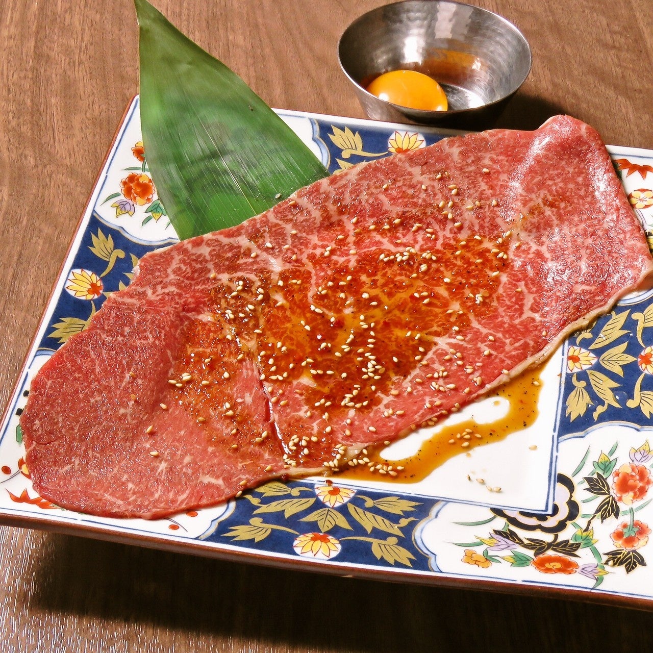 美しい刺しが入った、大判の和牛ロース。表面をさっと軽く火入れをしてから、お好みで、すき焼きのように卵黄を絡めて濃厚にいただくのもよし、さっぱりと塩ポン酢でいただくのも◎。