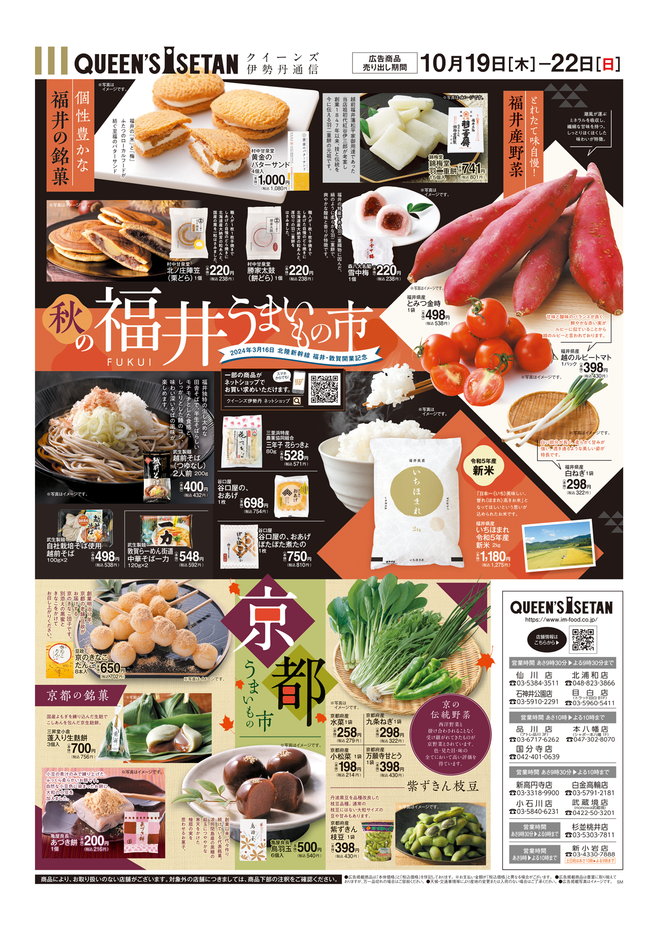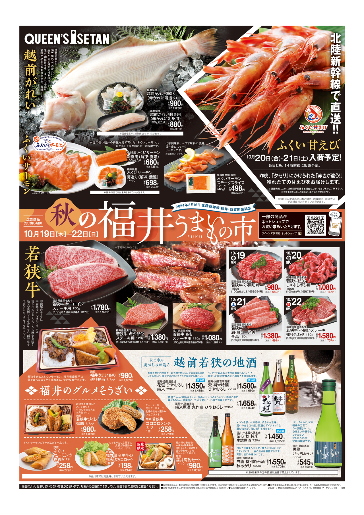福井県の美味しい秋の味覚がぎゅっと詰まった、今だからこそ味わえる期間限定のフェアです。福井ならではの海の幸、山の幸をこの機会にお楽しみください。クイーンズ伊勢丹では今後もより多くのお客さまに豊かなライフスタイルや価値のある体験をご提供するために様々な取り組みを行ってまいります。ぜひご期待ください。