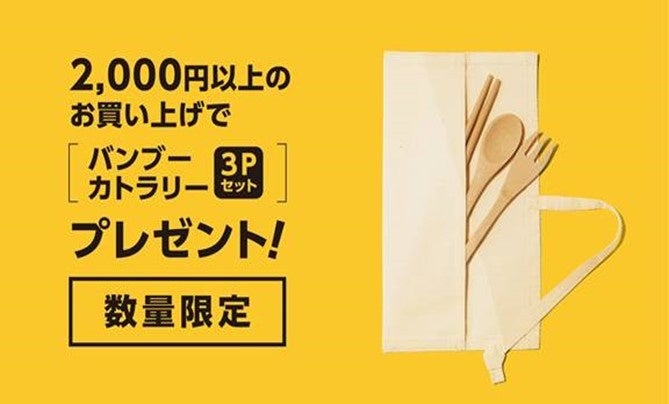 期間中、博多マルイ4Fコンセプトショップス内「長崎の逸品 Monthly」にて2,000円以上お買上げのお客さま、先着800名さまに、西九州新幹線のイラストが入ったオリジナルの「バンブーカトラリー」(3Pセット)をプレゼントいたします。