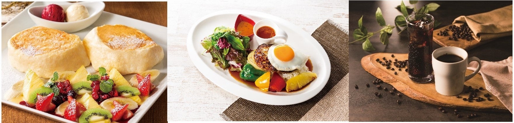 ご注文毎にメレンゲを立てて焼き上げる「特製ふわっとろパンケーキ」をはじめ、パスタやロコモコなどのカフェGOHAN、季節のフルーツをふんだんに使用したデザートまで多彩なメニューと、100%オーガニック珈琲豆とレインフォレスト・アライアンス認証の豆を使用した深いコクとすっきりとした後味が特徴のオリジナル珈琲などをご用意しています。