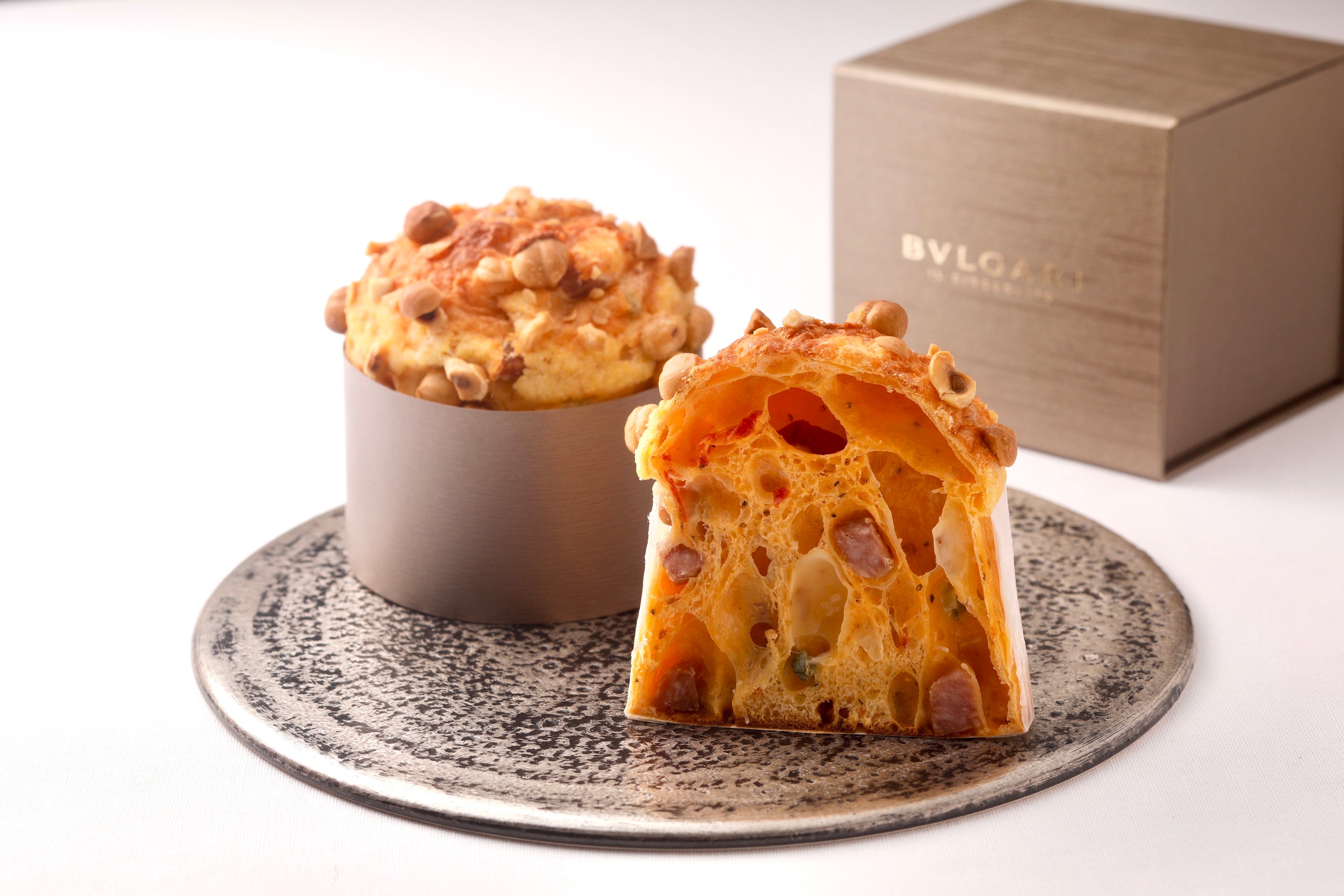 イタリアのホリデーシーズンに楽しまれる「パネットーネ」を甘くないセイボリータイプにアレンジし、ブルガリ イル・チョコラートのオリジナルレシピで丁寧に焼き上げた、「パネットーネ・サラート(Panettone Salato)」が今年も期間限定にて販売を開始致しました。柔らかい生地とそれぞれの食材の旨味を存分にお楽しみいただける「パネットーネ・サラート」は、イタリアを代表する食材、サラミ、スカモルツァ・アフミカータのスモークチーズ、ケッパーの酢漬け、ドライチェリートマトを生地と混ぜ合わせ、トッピングには、ピエモンテ産のヘーゼルナッツ、ポレンタ(トウモロコシの粉)とグラナパダーノの粉チーズ で香ばしく焼き上げました。風味豊かな自家製「パネットーネ・サラート」は、軽食から、お酒に合わせたおつまみまで、様々なダイニングシーンでお楽しみ頂けます。