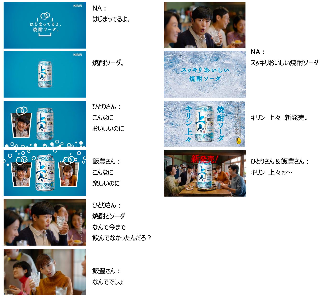 新TVCMでは、ひとりさんと飯豊さんが、気心知れた友人たちが集うホームパーティーに参加します。新商品「キリン 上々 焼酎ソーダ」とともに、それぞれが持ち寄った料理とおつまみ、にぎやかな会話を楽しむ中で、「なんで今まで飲んでなかったんだろ?」と焼酎とソーダを合わせた新しい飲み方とおいしさに気づくストーリーを通じて、「キリン 上々 焼酎ソーダ」新発売のニュースを訴求していきます。TVCM初共演とは思えない和気あいあいとした雰囲気の掛け合いや、独特の言い回しとドヤ顔で「キリン 上々ぉ~」とアピールする、印象的なカメラ目線のラストカットにご注目ください。