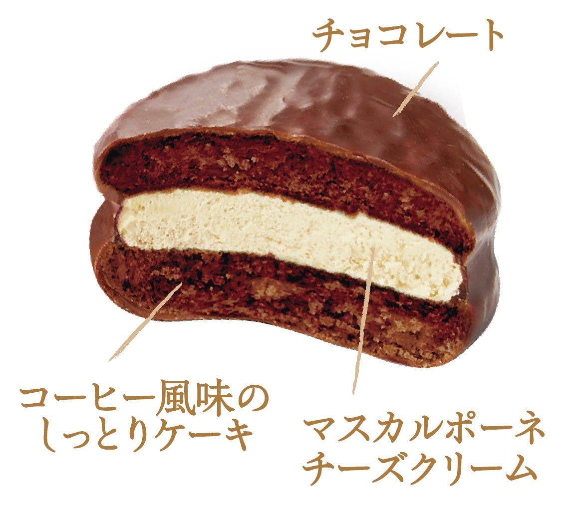 コーヒー風味のしっとりケーキで、マスカルポーネチーズクリームをサンドし、チョコレートでコーティングしました。