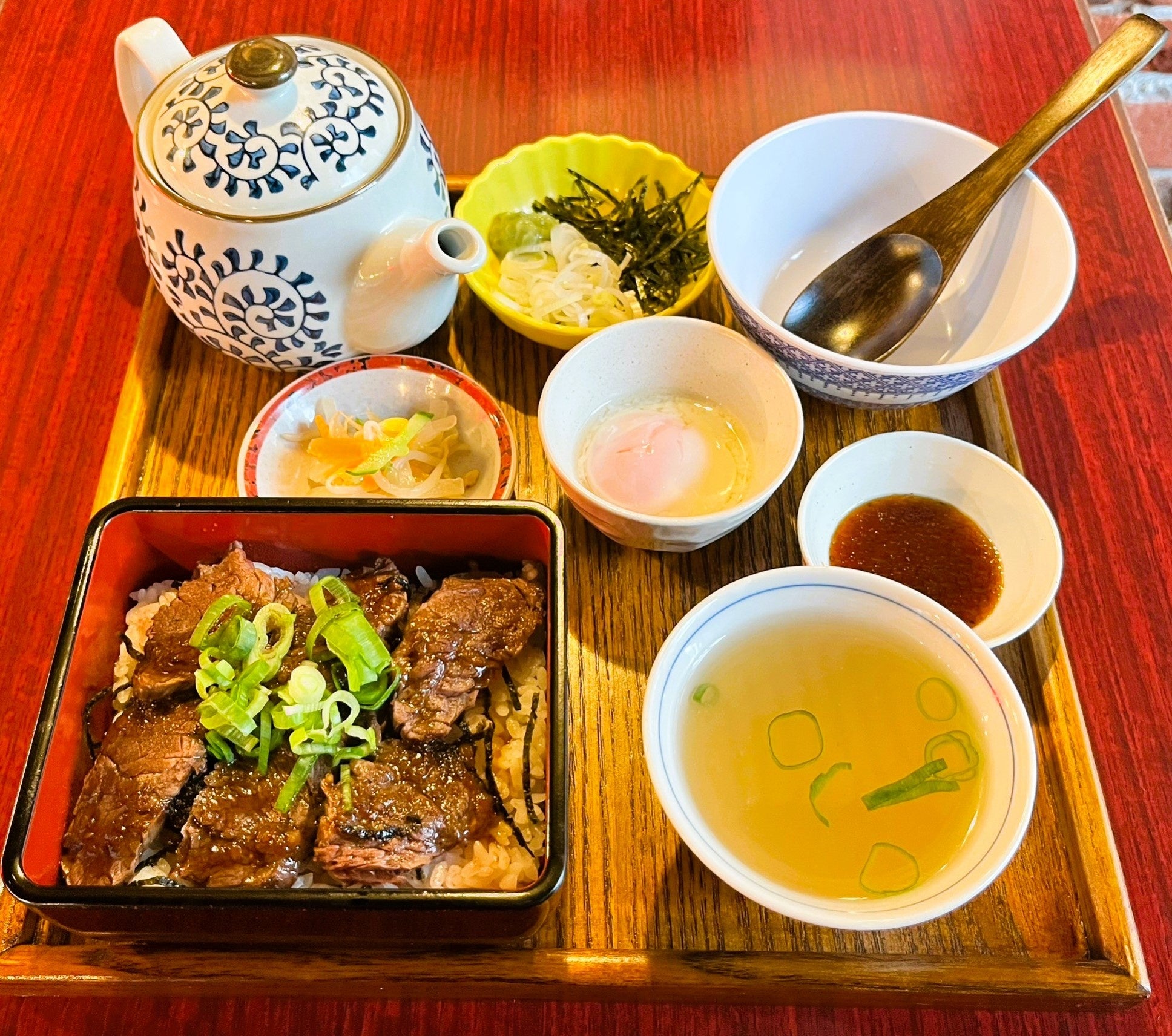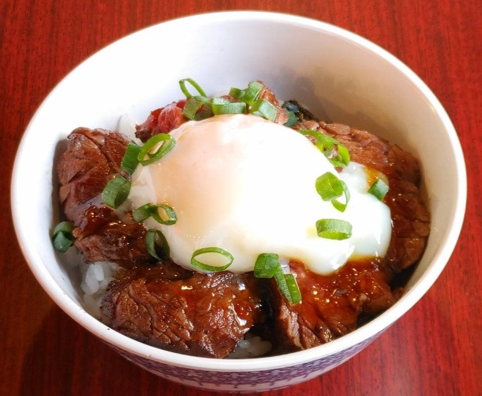 牛ハラミ肉、ご飯、タレをさらにマイルドに味わって頂きたく、トロっと食感の温泉卵を投入!