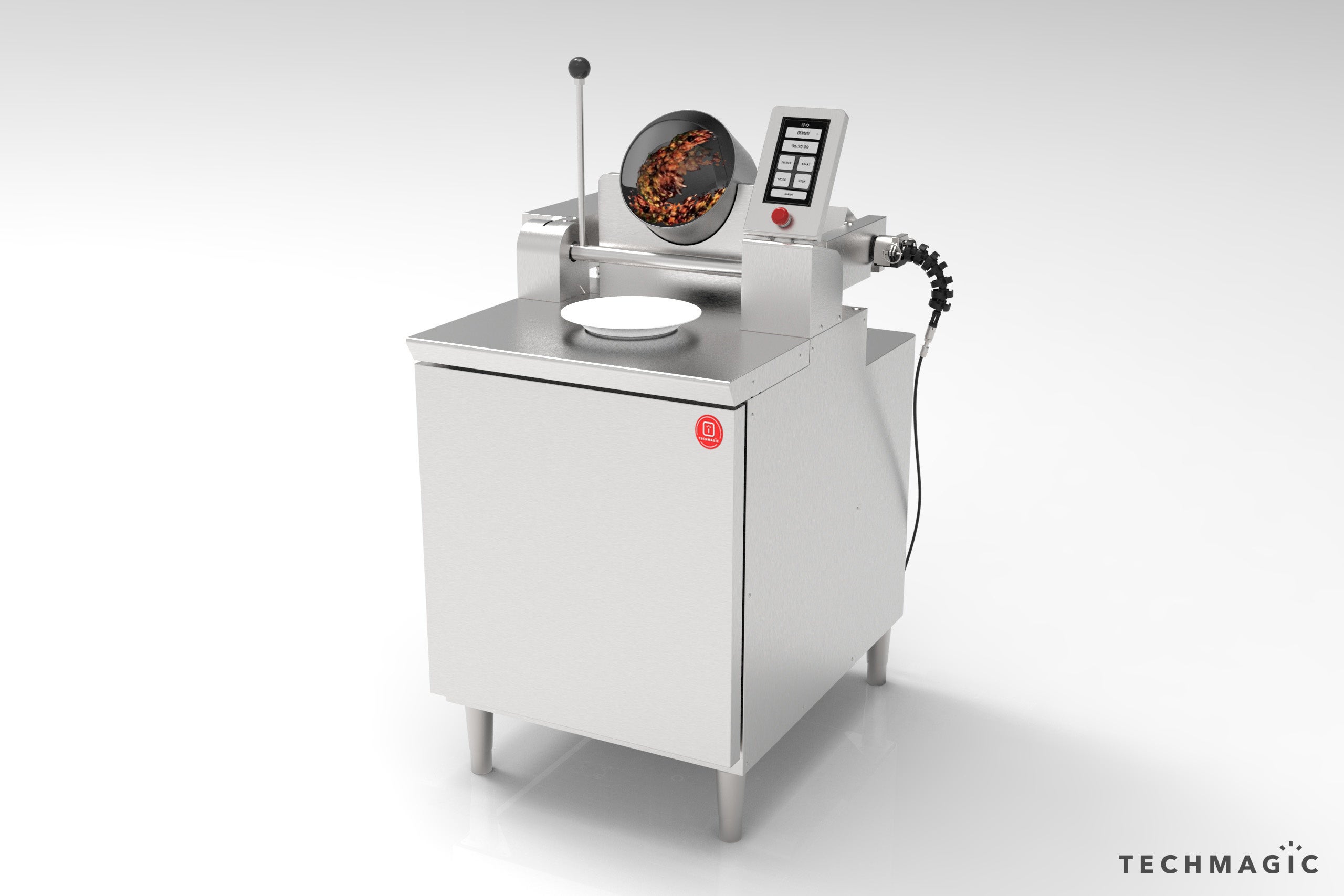 TechMagicが開発した調理ロボットI-Roboは、炒飯・野菜炒めなど、熟練の職人のレシピを自動で再現します。また、I-Roboは、液体調味料の自動供給機能をオプションで追加可能で、調味、攪拌、加熱、調理後のフライパンの洗浄といった一連の動作を自動化することができるロボットです。自動調
