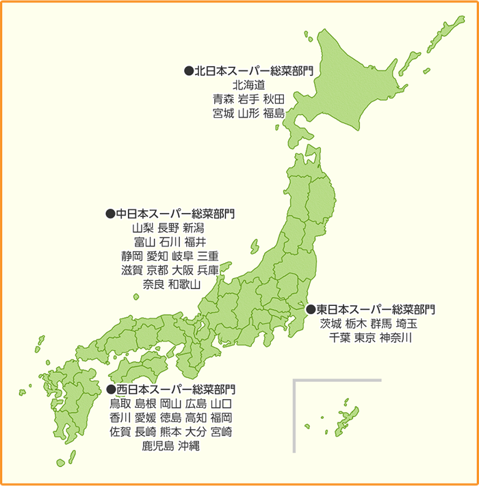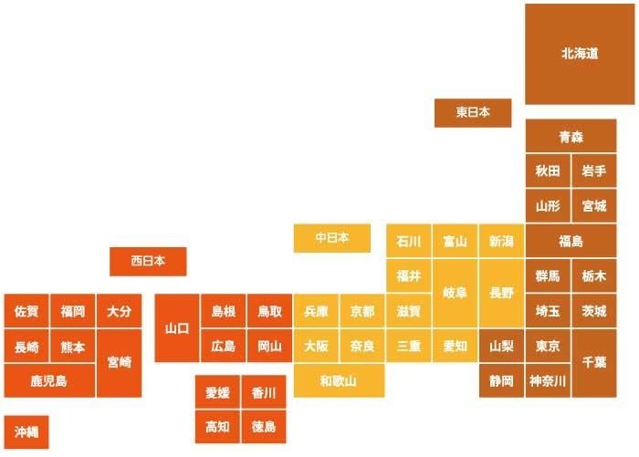 東日本:北海道、青森、岩手、秋田、福島、栃木、群馬、茨城、埼玉、千葉、東京、神奈川、山梨、静岡