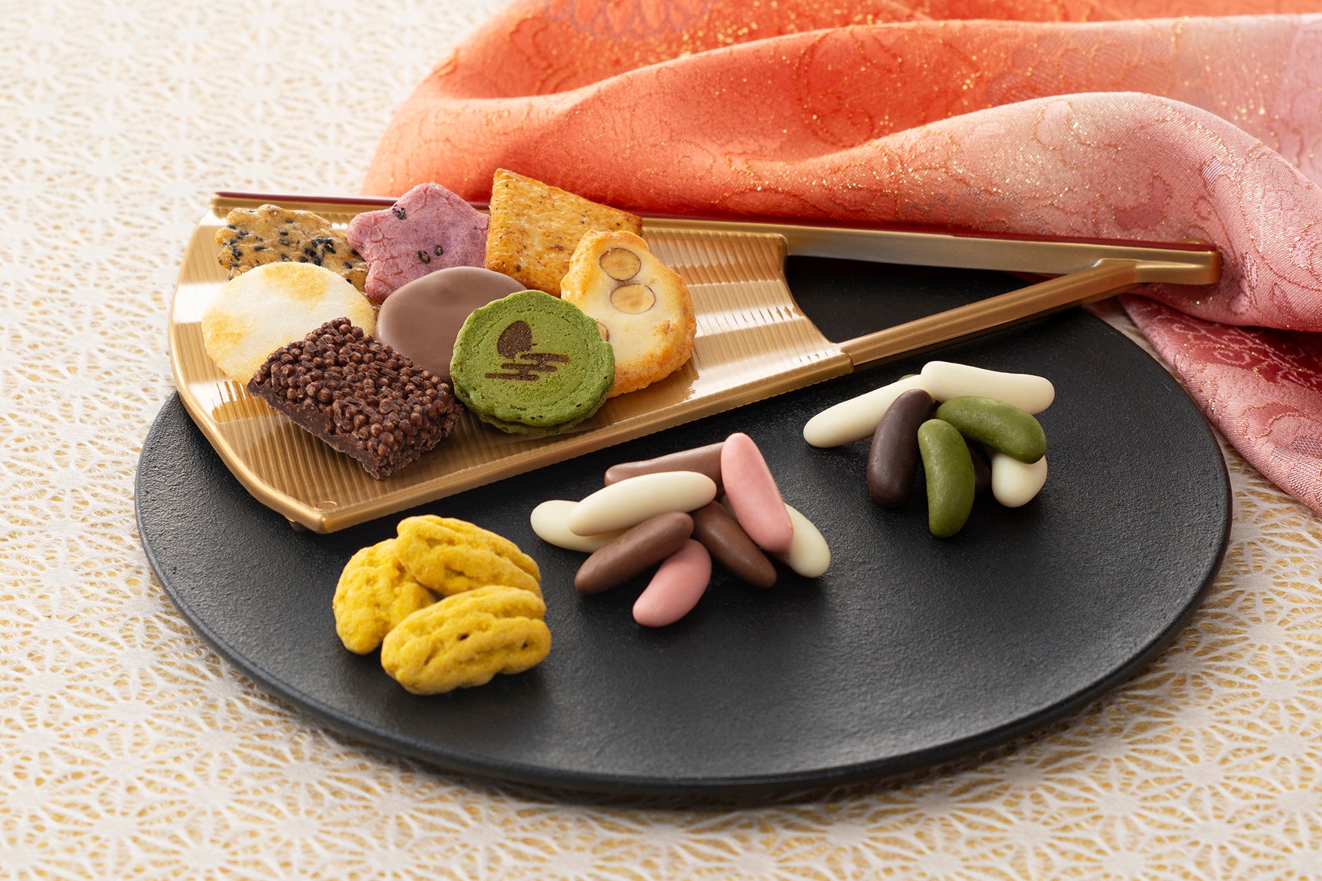 小倉山荘の代表菓『をぐら山春秋』をはじめ、創業の一品『嵯峨乃焼』などバラエティ豊かな11種28袋をお詰めしました。柿の種にチョコをコーティングした『想ひそめし』や、感謝祭でしか出会えない『カレー煎餅』などが一度に楽しめるのも、この秋の『お福分け』だけ。